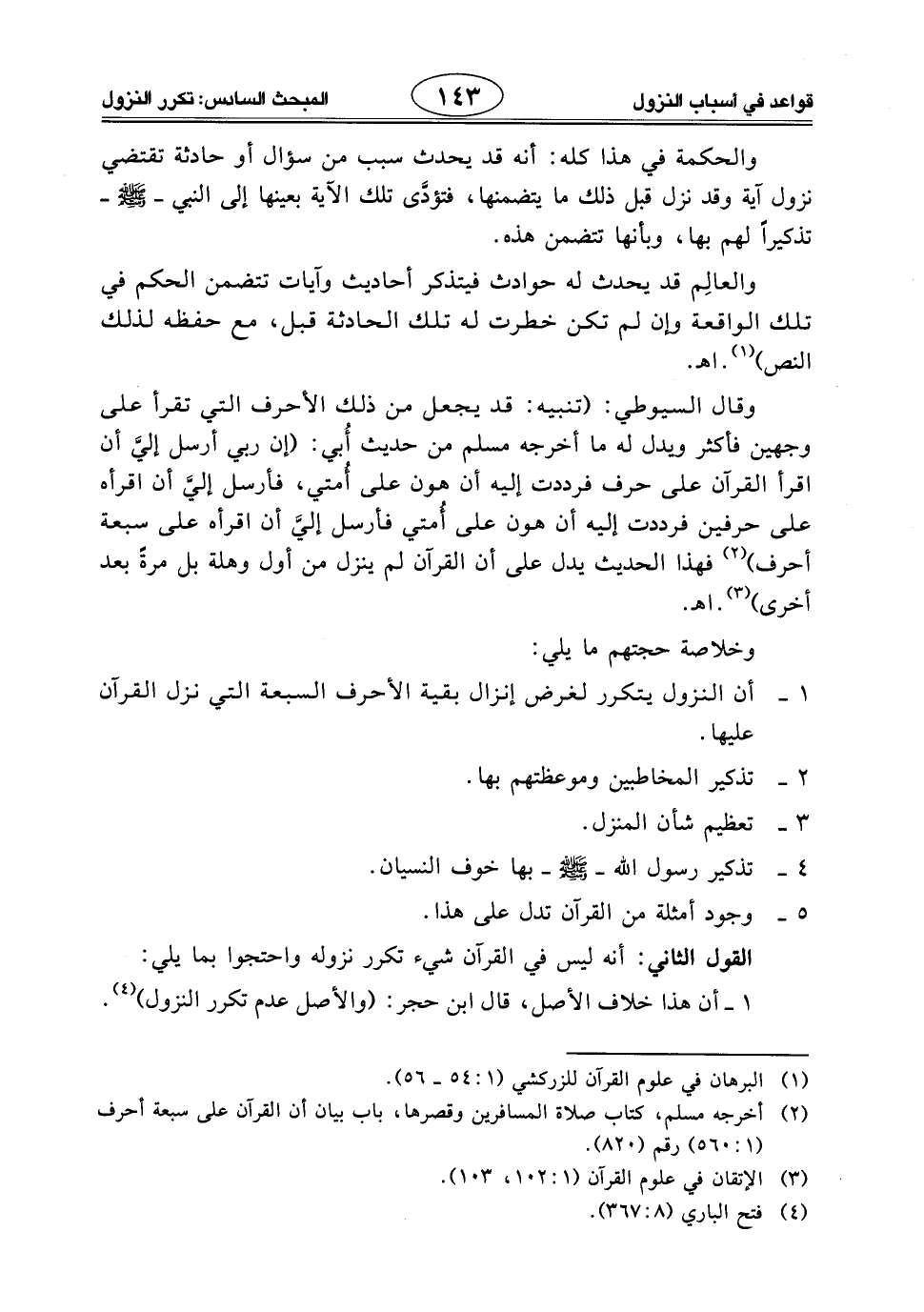 1 - أن النزول يتكرر لغرض إنزال بقية الأحرف السبعة التي نزل القرآن عليها.