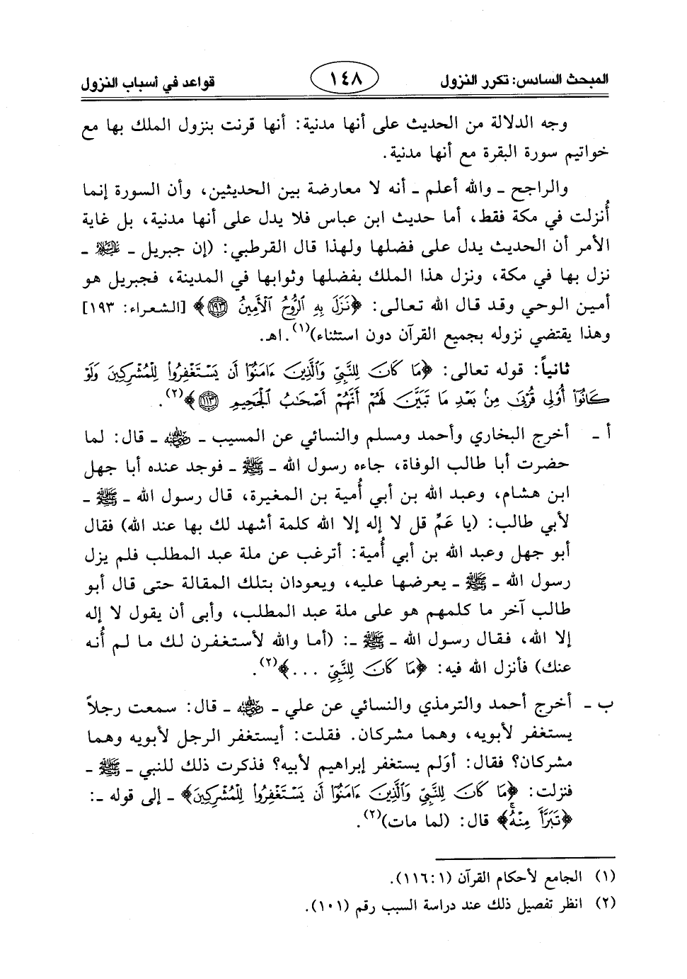 ب - أخرج أحمد والترمذي والنَّسَائِي عن علي - رَضِيَ اللَّهُ عَنْهُ - قال: سمعت رجلاً يستغفر لأبويه، وهما مشركان. فقلت: أيستغفر الرجل لأبويه وهما مشركان؟ فقال: أوَلم يستغفر إبراهيم لأبيه؟ فذكرت ذلك للنبي - صَلَّى اللَّهُ عَلَيْهِ وَسَلَّمَ - فنزلت: (مَا كَانَ لِلنَّبِيِّ وَالَّذِينَ آمَنُوا أَنْ يَسْتَغْفِرُوا لِلْمُشْرِكِينَ) - إلى قوله -: (تَبَرَّأَ مِنْهُ) قال: (لما مات).