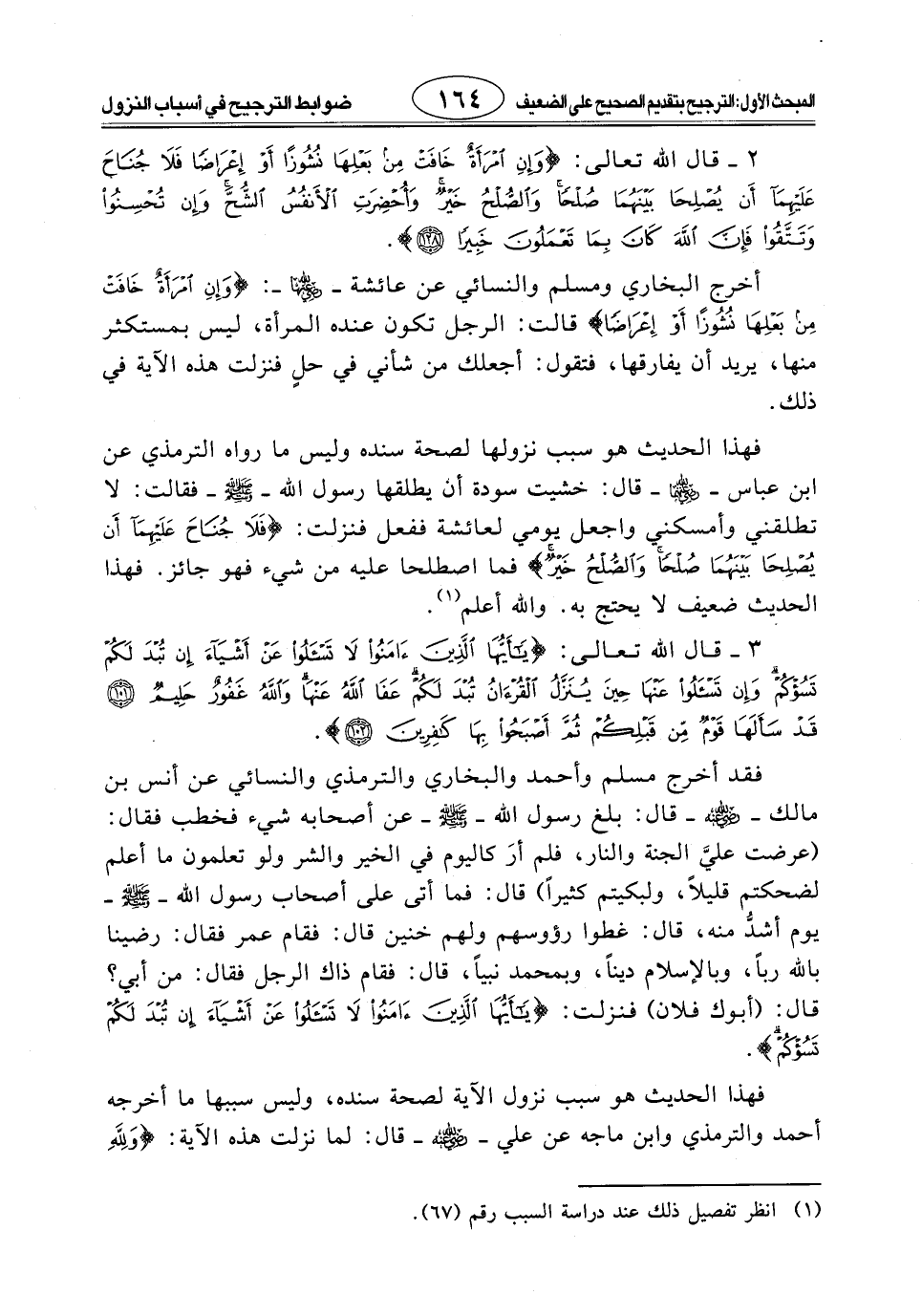 فهذا الحديث هو سبب نزولها لصحة سنده وليس ما رواه الترمذي عن ابن عبَّاسٍ - رَضِيَ اللَّهُ عَنْهُمَا - قال: خشيت سودة أن يطلقها رسول اللَّه - صَلَّى اللَّهُ عَلَيْهِ وَسَلَّمَ - فقالت: لا تطلقني وأمسكني واجعل يومي لعائشة ففعل فنزلت: (فَلَا جُنَاحَ عَلَيْهِمَا أَنْ يُصْلِحَا بَيْنَهُمَا صُلْحًا وَالصُّلْحُ خَيْرٌ) فما اصطلحا عليه من شيء فهو جائز. فهذا الحديث ضعيف لا يحتج به. والله أعلم.