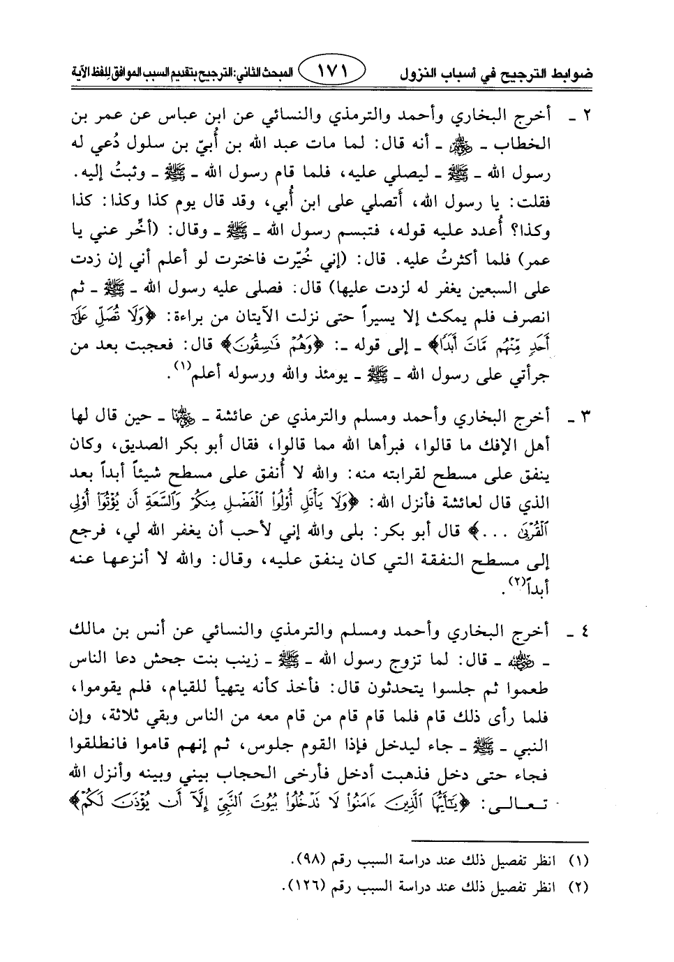 2 - أخرج البخاري وأحمد والترمذي والنَّسَائِي عن ابن عبَّاسٍ عن عمر بن الخطاب - رَضِيَ اللَّهُ عَنْهُ - أنه قال: لما مات عبد اللَّه بن أُبيّ بن سلول دُعي له رسول اللَّه - صَلَّى اللَّهُ عَلَيْهِ وَسَلَّمَ - ليصلي عليه، فلما قام رسول اللَّه - صَلَّى اللَّهُ عَلَيْهِ وَسَلَّمَ - وثبتُ إليه. فقلت: يا رسول الله، أَتصلي على ابن أبي، وقد قال يوم كذا وكذا: كذا وكذا؟ أُعدد عليه قوله، فتبسم رسول الله - رَضِيَ اللَّهُ عَنْهُ - وقال: (أخِّر عني يا عمر) فلما أكثرتُ عليه. قال: (إني خُيّرت فاخترت لو أعلم أني إن زدت على السبعين يغفر له لزدت عليها) قال. فصلى عليه رسول الله - صَلَّى اللَّهُ عَلَيْهِ وَسَلَّمَ - ثم انصرف فلم يمكث إلا يسيراً حتى نزلت الآيتان من براءة: (وَلَا تُصَلِّ عَلَى أَحَدٍ مِنْهُمْ مَاتَ أَبَدًا) - إلى قوله -: (وَهُمْ فَاسِقُونَ) قال: فعجبت بعد من جرأتي على رسول الله - صَلَّى اللَّهُ عَلَيْهِ وَسَلَّمَ - يومئذ واللَّه ورسوله أعلم.