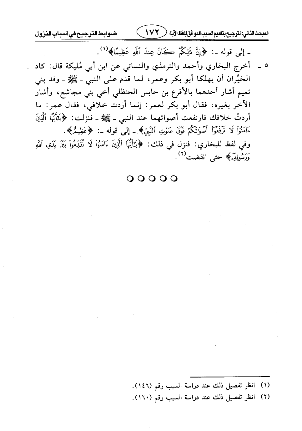 5 - أخرج البخاري وأحمد والترمذي والنَّسَائِي عن ابن أبي مُليكة قال: كاد الخيِّران أن يهلكا أبو بكر وعمر، لما قدم على النبي - صَلَّى اللَّهُ عَلَيْهِ وَسَلَّمَ - وفد بني تميم أشار أحدهما بالأقرع بن حابس الحنظلي أخي بني مجاشع، وأشار الآخر بغيره، فقال أبو بكر لعمر: إنما أردت خلافي، فقال عمر: ما أردتُ خلافك فارتفعت أصواتهما عند النبي - صَلَّى اللَّهُ عَلَيْهِ وَسَلَّمَ - فنزلت: (يَا أَيُّهَا الَّذِينَ آمَنُوا لَا تَرْفَعُوا أَصْوَاتَكُمْ فَوْقَ صَوْتِ النَّبِيِّ) - إلى قوله -: (عَظِيمٌ).