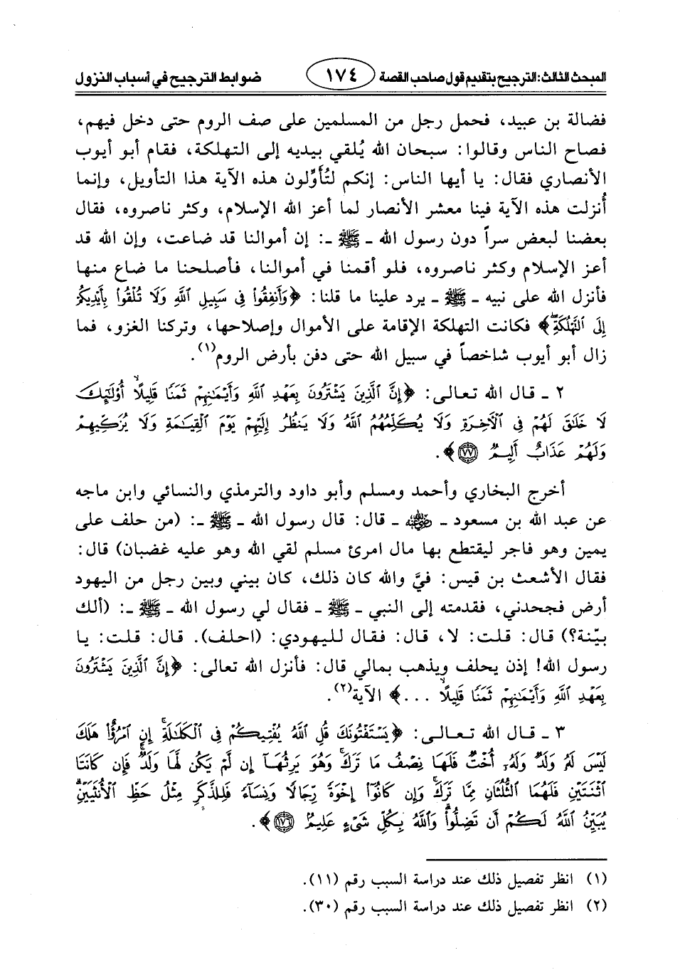 فضالة بن عبيد، فحمل رجل من المسلمين على صف الروم حتى دخل فيهم، فصاح الناس وقالوا: سبحان الله يُلقي بيديه إلى التهلكة، فقام أبو أيوب الأنصاري فقال: يا أيها الناس: إنكم لتُأوِّلون هذه الآية هذا التأويل، وإنما أُنزلت هذه الآية فينا معشر الأنصار لما أعز الله الإسلام، وكثر ناصروه، فقال بعضنا لبعض سراً دون رسول الله - صَلَّى اللَّهُ عَلَيْهِ وَسَلَّمَ -: إن أموالنا قد ضاعت، وإن الله قد أعز الإسلام وكثر ناصروه، فلو أقمنا في أموالنا، فأصلحنا ما ضاع منها فأنزل الله على نبيه - صَلَّى اللَّهُ عَلَيْهِ وَسَلَّمَ - يرد علينا ما قلنا: وَأَنْفِقُوا فِي سَبِيلِ اللَّهِ وَلَا تُلْقُوا بِأَيْدِيكُمْ إِلَى التَّهْلُكَةِ) فكانت التهلكة الإقامة على الأموال وإصلاحها، وتركنا الغزو، فما زال أبو أيوب شاخصاً في سبيل الله حتى دفن بأرض الروم.