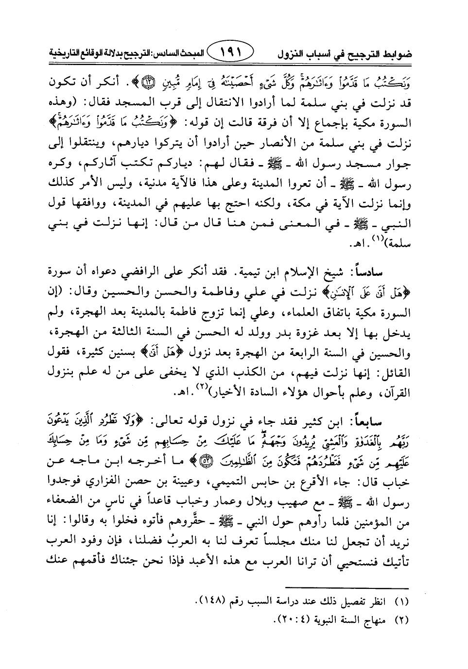 سادساً: شيخ الإسلام ابن تيمية. فقد أنكر على الرافضي دعواه أن سورة (هَلْ أَتَى عَلَى الْإِنْسَانِ) نزلت في علي وفاطمة والحسن والحسين وقال: (إن السورة مكية باتفاق العلماء، وعلي إنما تزوج فاطمة بالمدينة بعد الهجرة، ولم يدخل بها إلا بعد غزوة بدر وولد له الحسن في السنة الثالثة من الهجرة، والحسين في السنة الرابعة من الهجرة بعد نزول (هَلْ أَتَى) بسنين كثيرة، فقول القائل: إنها نزلت فيهم، من الكذب الذي لا يخفى على من له علم بنزول القرآن، وعلم بأحوال هؤلاء السادة الأخيار). اهـ.