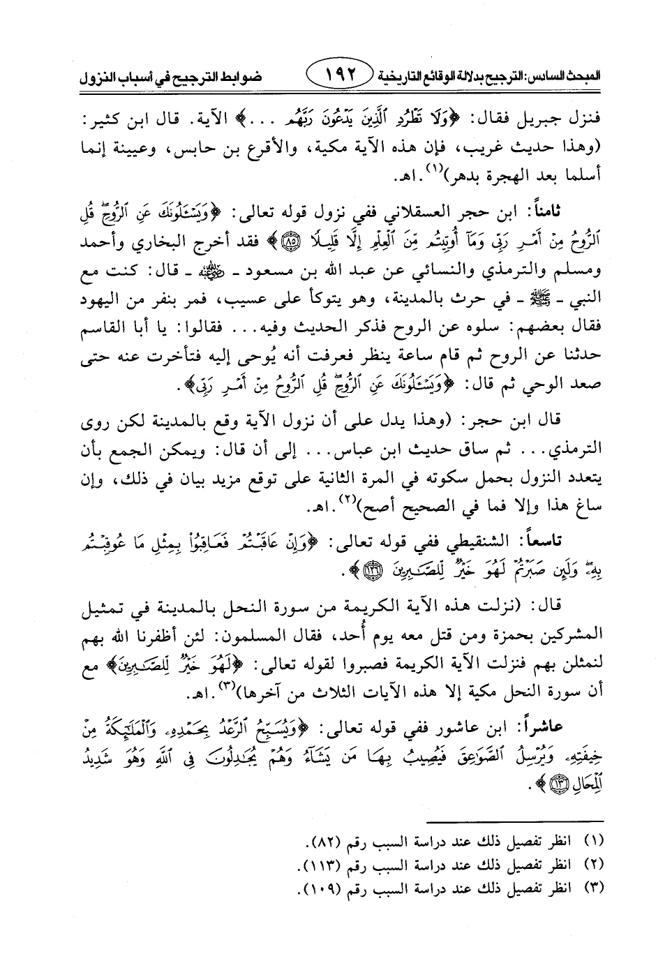 ثامناً: ابن حجر العسقلاني ففي نزول قوله تعالى: (وَيَسْأَلُونَكَ عَنِ الرُّوحِ قُلِ الرُّوحُ مِنْ أَمْرِ رَبِّي وَمَا أُوتِيتُمْ مِنَ الْعِلْمِ إِلَّا قَلِيلًا) فقد أخرج البخاري وأحمد ومسلم والترمذي والنَّسَائِي عن عبد اللَّه بن مسعود - رَضِيَ اللَّهُ عَنْهُ - قال: كنت مع النبي - صَلَّى اللَّهُ عَلَيْهِ وَسَلَّمَ - في حرث بالمدينة، وهو يتوكأ على عسيب، فمر بنفر من اليهود فقال بعضهم: سلوه عن الروح فذكر الحديث وفيه ... فقالوا: يا أبا القاسم حدثنا عن الروح ثم قام ساعة ينظر فعرفت أنه يُوحى إليه فتأخرت عنه حتى صعد الوحي ثم قال: (وَيَسْأَلُونَكَ عَنِ الرُّوحِ قُلِ الرُّوحُ مِنْ أَمْرِ رَبِّي).