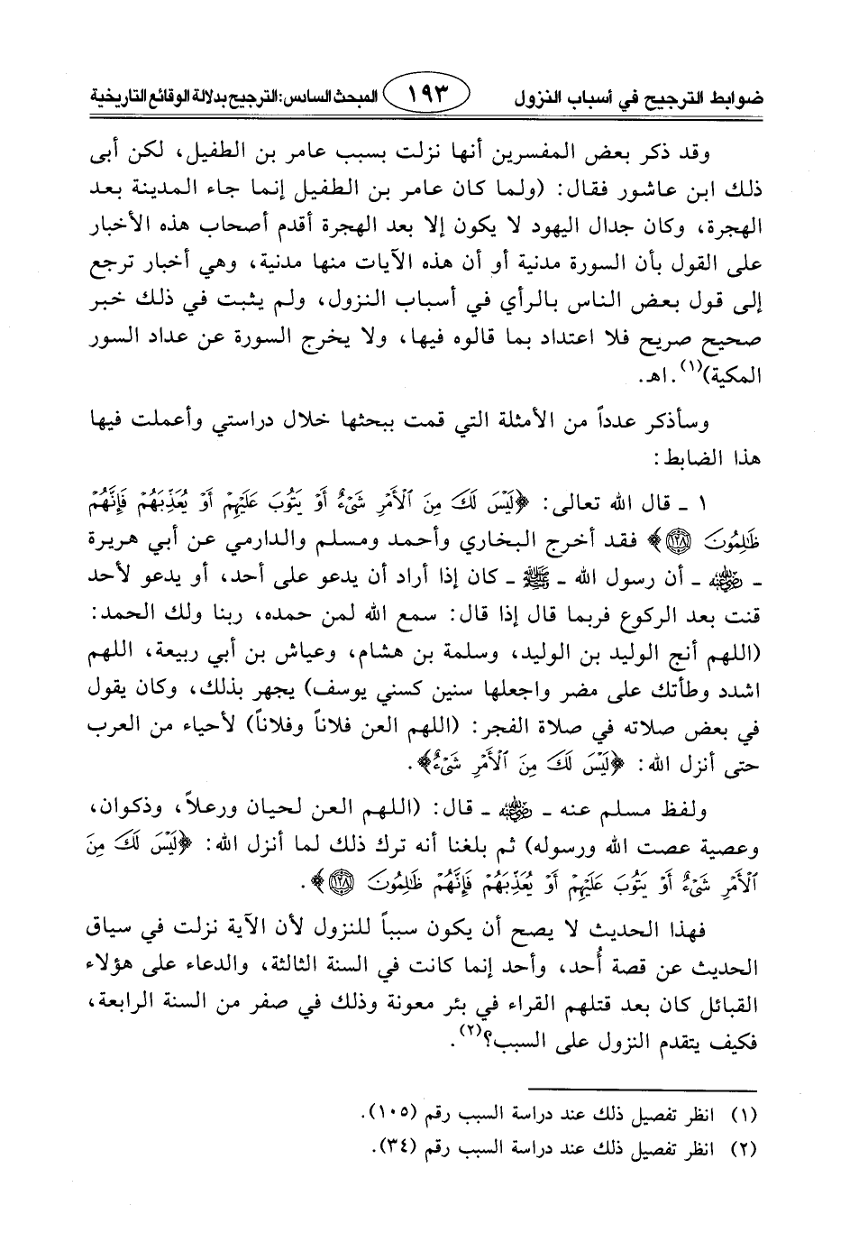 فهذا الحديث لا يصح أن يكون سبباً للنزول لأن الآية نزلت في سياق الحديث عن قصة أُحد، وأحد إنما كانت في السنة الثالثة، والدعاء على هؤلاء القبائل كان بعد قتلهم القراء في بئر معونة وذلك في صفر من السنة الرابعة، فكيف يتقدم النزول على السبب؟.