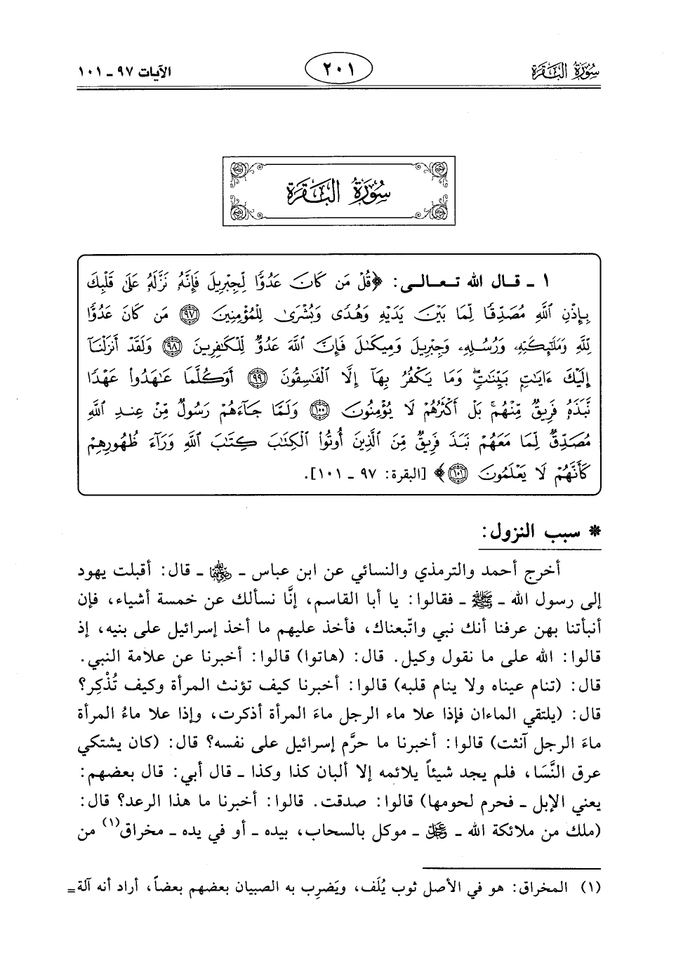 1 - قال اللَّه تعالى: (قُلْ مَنْ كَانَ عَدُوًّا لِجِبْرِيلَ فَإِنَّهُ نَزَّلَهُ عَلَى قَلْبِكَ بِإِذْنِ اللَّهِ مُصَدِّقًا لِمَا بَيْنَ يَدَيْهِ وَهُدًى وَبُشْرَى لِلْمُؤْمِنِينَ (97) مَنْ كَانَ عَدُوًّا لِلَّهِ وَمَلَائِكَتِهِ وَرُسُلِهِ وَجِبْرِيلَ وَمِيكَالَ فَإِنَّ اللَّهَ عَدُوٌّ لِلْكَافِرِينَ (98) وَلَقَدْ أَنْزَلْنَا إِلَيْكَ آيَاتٍ بَيِّنَاتٍ وَمَا يَكْفُرُ بِهَا إِلَّا الْفَاسِقُونَ (99) أَوَكُلَّمَا عَاهَدُوا عَهْدًا نَبَذَهُ فَرِيقٌ مِنْهُمْ بَلْ أَكْثَرُهُمْ لَا يُؤْمِنُونَ (100) وَلَمَّا جَاءَهُمْ رَسُولٌ مِنْ عِنْدِ اللَّهِ مُصَدِّقٌ لِمَا مَعَهُمْ نَبَذَ فَرِيقٌ مِنَ الَّذِينَ أُوتُوا الْكِتَابَ كِتَابَ اللَّهِ وَرَاءَ ظُهُورِهِمْ كَأَنَّهُمْ لَا يَعْلَمُونَ (101)