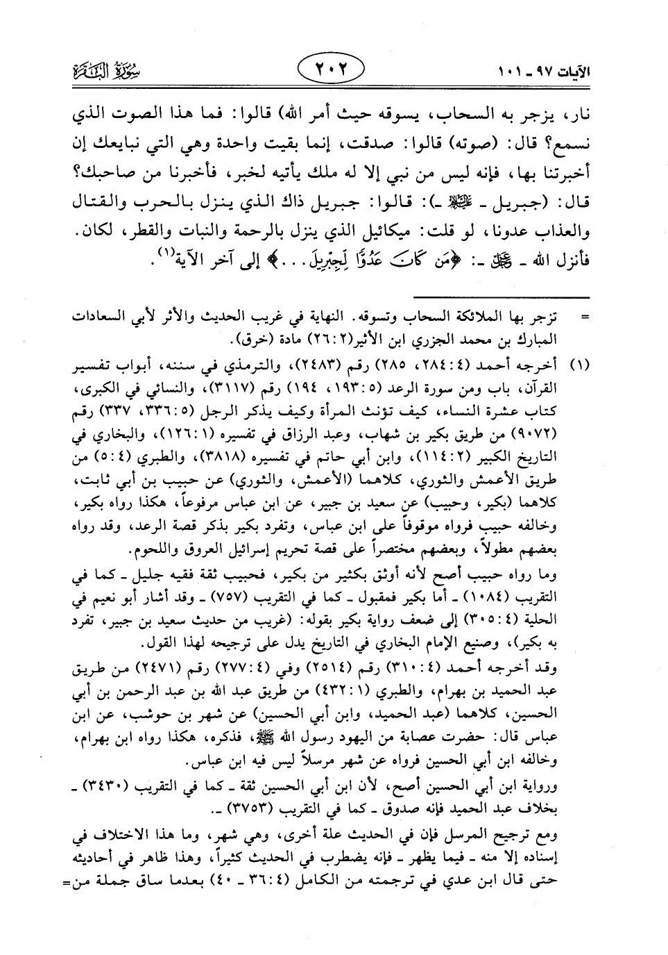 نار، يزجر به السحاب، يسوقه حيث أمر اللَّه) قالوا: فما هذا الصوت الذي نسمع؟ قال: (صوته) قالوا: صدقت، إنما بقيت واحدة وهي التي نبايعك إن أخبرتنا بها، فإنه ليس من نبي إلا له ملك يأتيه لخبر، فأخبرنا من صاحبك؟ قال: (جبريل - عليه السلام -): قالوا: جبريل ذاك الذي ينزل بالحرب والقتال والعذاب عدونا، لو قلت: ميكائيل الذي ينزل بالرحمة والنبات والقطر، لكان. فأنزل اللَّه - عَزَّ وَجَلَّ -: (مَنْ كَانَ عَدُوًّا لِجِبْرِيلَ ... ) إلى آخر الآية.