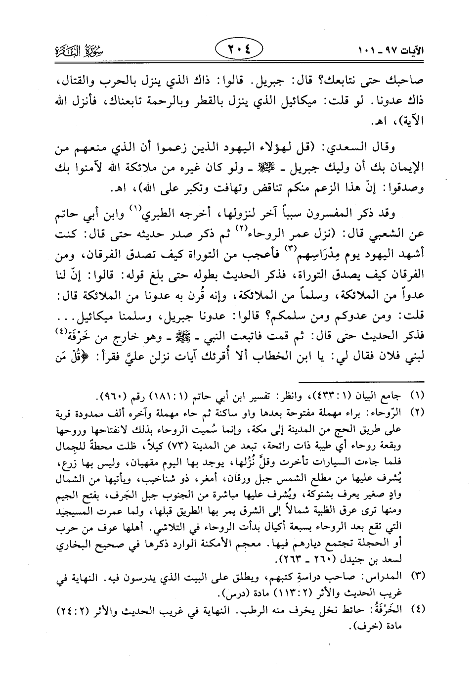 وقال السعدي: (قل لهؤلاء اليهود الذين زعموا أن الذي منعهم من الإيمان بك أن وليك جبريل - عليه السلام - ولو كان غيره من ملائكة اللَّه لآمنوا بك وصدقوا: إنّ هذا الزعم منكم تناقض وتهافت وتكبر على اللَّه)، اهـ.