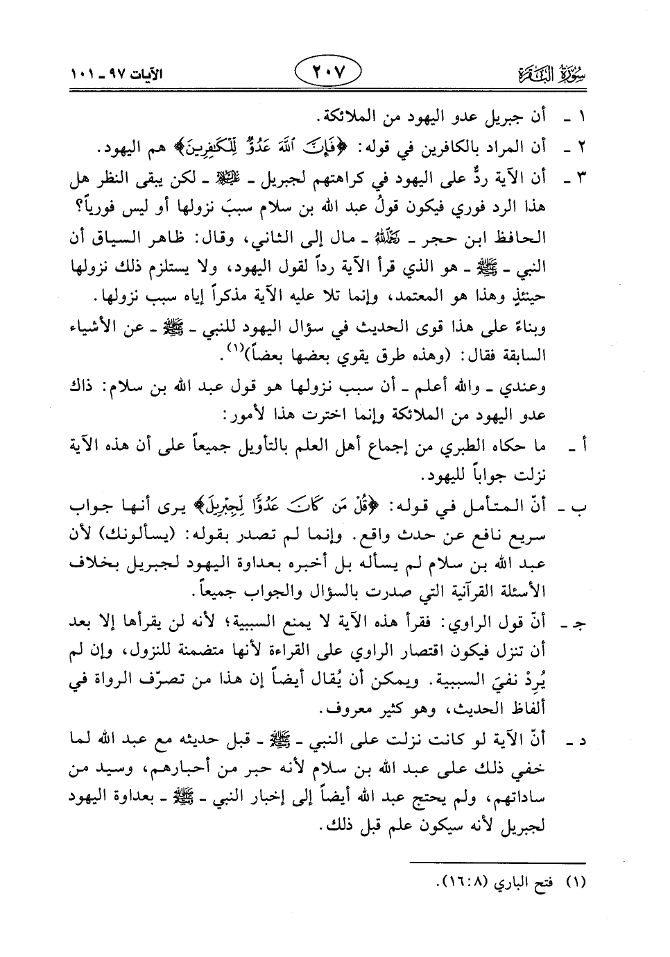 3 - أن الآية ردٌّ على اليهود في كراهتهم لجبريل - عليه السلام - لكن يبقى النظر هل هذا الرد فوري فيكون قولُ عبد الله بن سلام سببَ نزولها أو ليس فوريًا؟ الحافظ ابن حجر - رحمه الله - مال إلى الثاني، وقال: ظاهر السياق أن النبي - صَلَّى اللَّهُ عَلَيْهِ وَسَلَّمَ - هو الذي قرأ الآية رداً لقول اليهود، ولا يستلزم ذلك نزولها حيئنذٍ وهذا هو المعتمد، وإنما تلا عليه الآية مذكرًا إياه سبب نزولها.