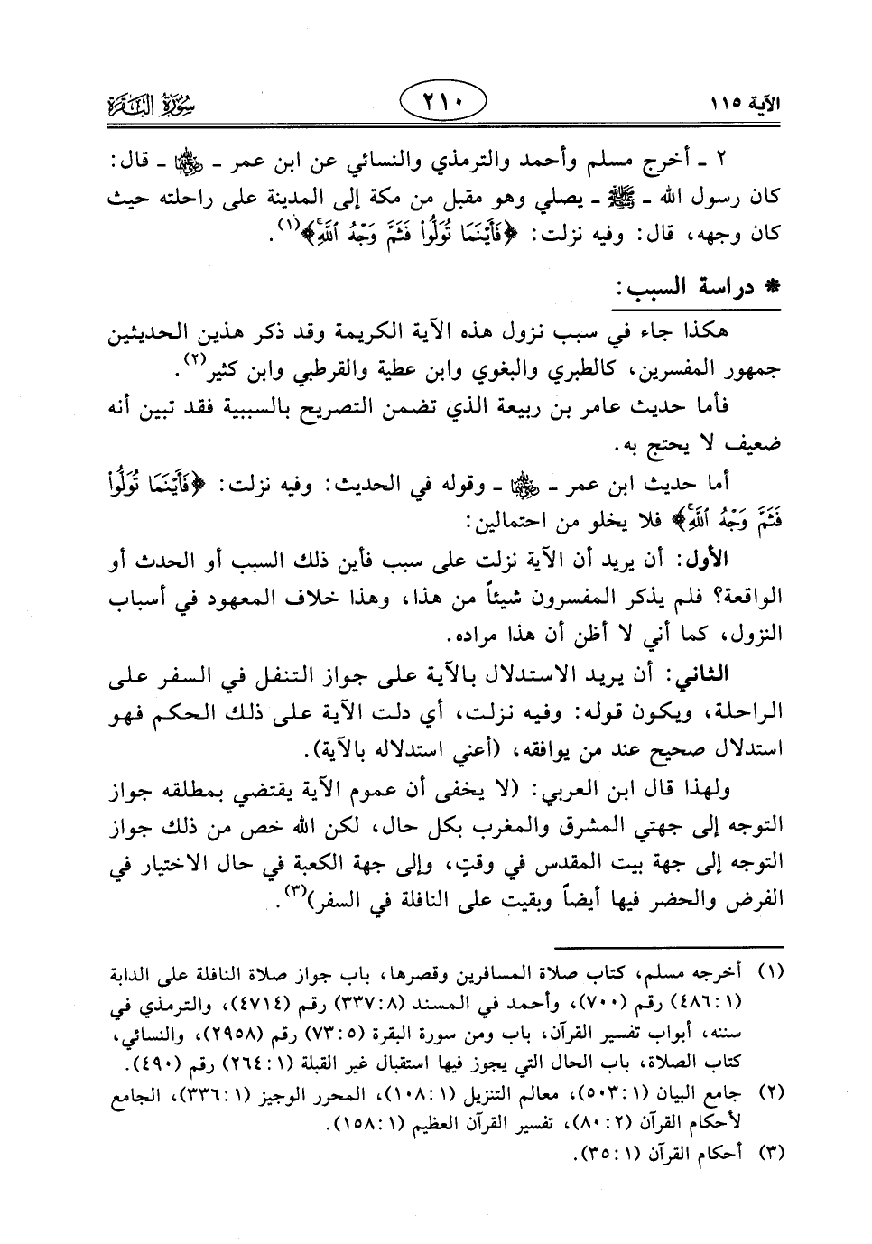 2 - أخرج مسلم وأحمد والترمذي والنَّسَائِي عن ابن عمر - رَضِيَ اللَّهُ عَنْهُمَا - قال: كان رسول الله - صَلَّى اللَّهُ عَلَيْهِ وَسَلَّمَ - يصلي وهو مقبل من مكة إلى المدينة على راحلته حيث كان وجهه، قال: وفيه نزلت: (فَأَيْنَمَا تُوَلُّوا فَثَمَّ وَجْهُ اللَّهِ).