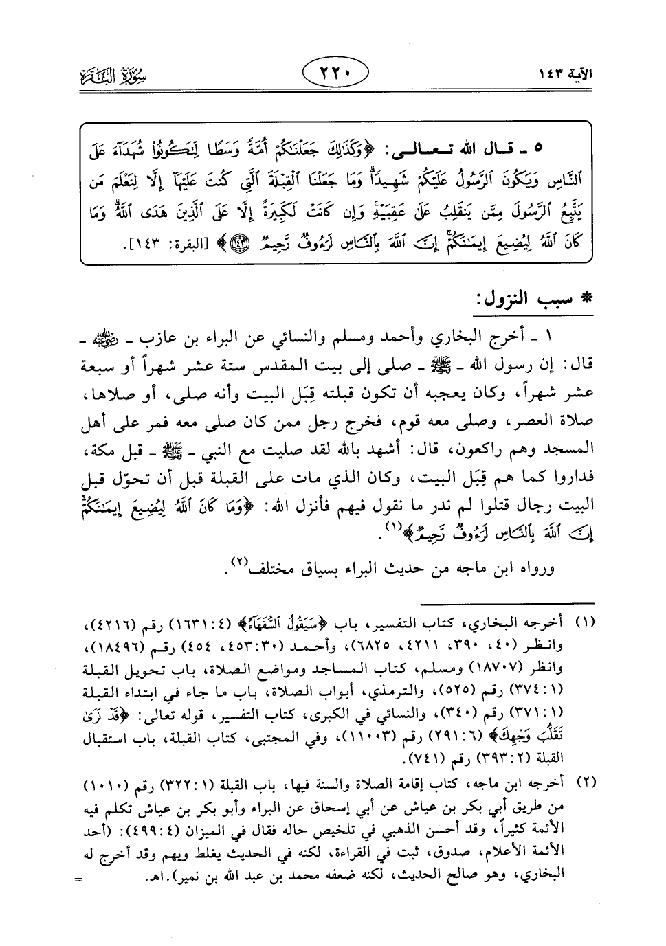 1 - أخرج البخاري وأحمد ومسلم والنَّسَائِي عن البراء بن عازب - رَضِيَ اللَّهُ عَنْهُ - قال: إن رسول الله - صَلَّى اللَّهُ عَلَيْهِ وَسَلَّمَ - صلى إلى بيت المقدس ستة عشر شهرًا أو سبعة عشر شهرًا، وكان يعجبه أن تكون قبلته قِبَل البيت وأنه صلى، أو صلاها، صلاة العصر، وصلى معه قوم، فخرج رجل ممن كان صلى معه فمر على أهل المسجد وهم راكعون، قال: أشهد باللَّه لقد صليت مع النبي - صَلَّى اللَّهُ عَلَيْهِ وَسَلَّمَ - قبل مكة، فداروا كما هم قِبَل البيت، وكان الذي مات على القبلة قبل أن تحوّل قبل البيت رجال قتلوا لم ندر ما نقول فيهم فأنزل اللَّه: (وَمَا كَانَ اللَّهُ لِيُضِيعَ إِيمَانَكُمْ إِنَّ اللَّهَ بِالنَّاسِ لَرَءُوفٌ رَحِيمٌ).
