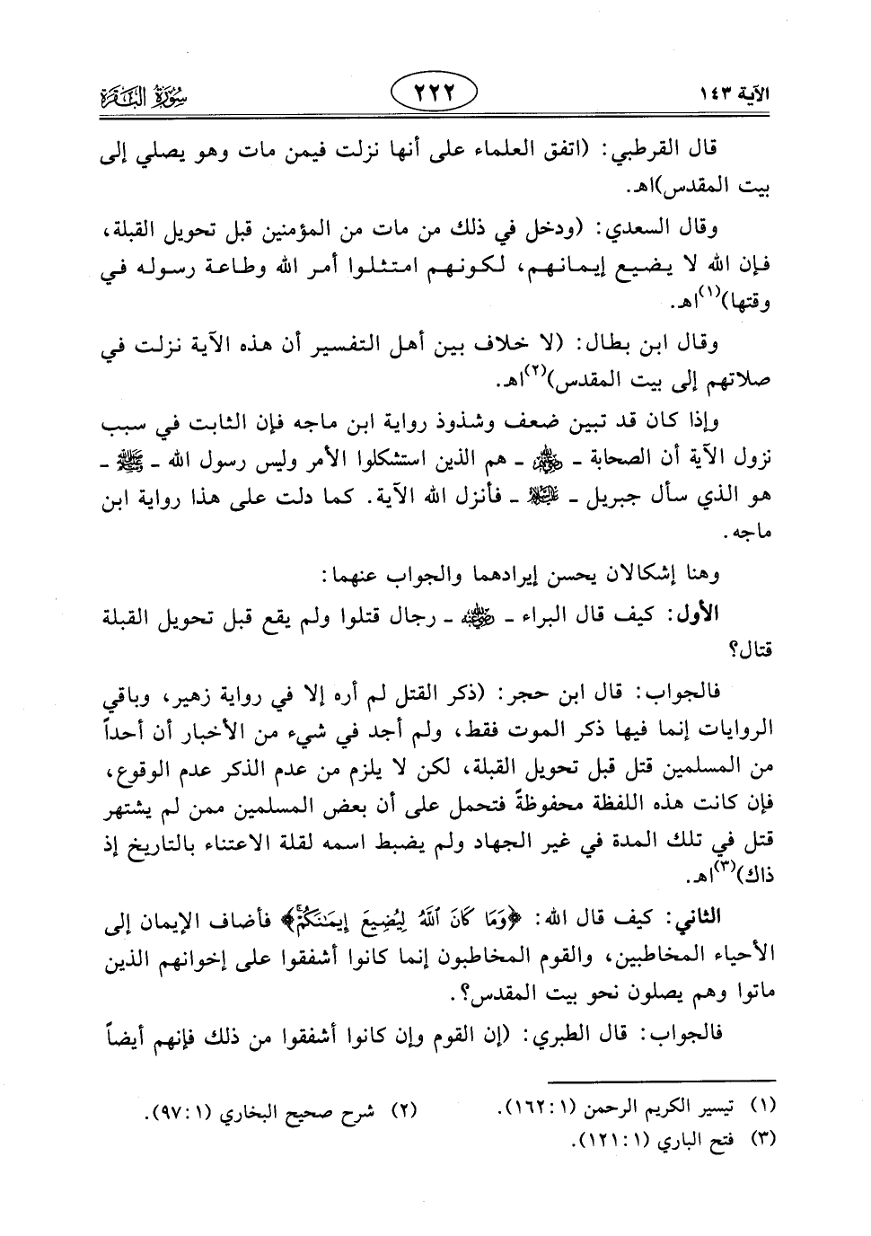 الأول: كيف قال البراء - رَضِيَ اللَّهُ عَنْهُ - رجال قتلوا ولم يقع قبل تحويل القبلة قتال؟
