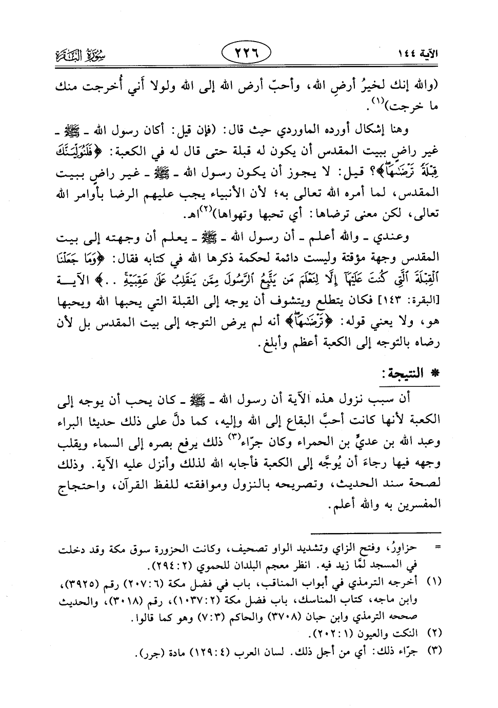 (¬1) الرضا له معنيان رضا محبة، ورضا تفويض وتسليم، وكلاهما تحقق للنبي - صَلَّى اللَّهُ عَلَيْهِ وَسَلَّمَ - رضا محبة وكان متمثلاً في التوجه إلى البيت الحرام، ورضا تسليم وكان متمثلاً في التوجه إلى بيت المقدس. والله أعلم. (مصحح النسخة الإلكترونية).