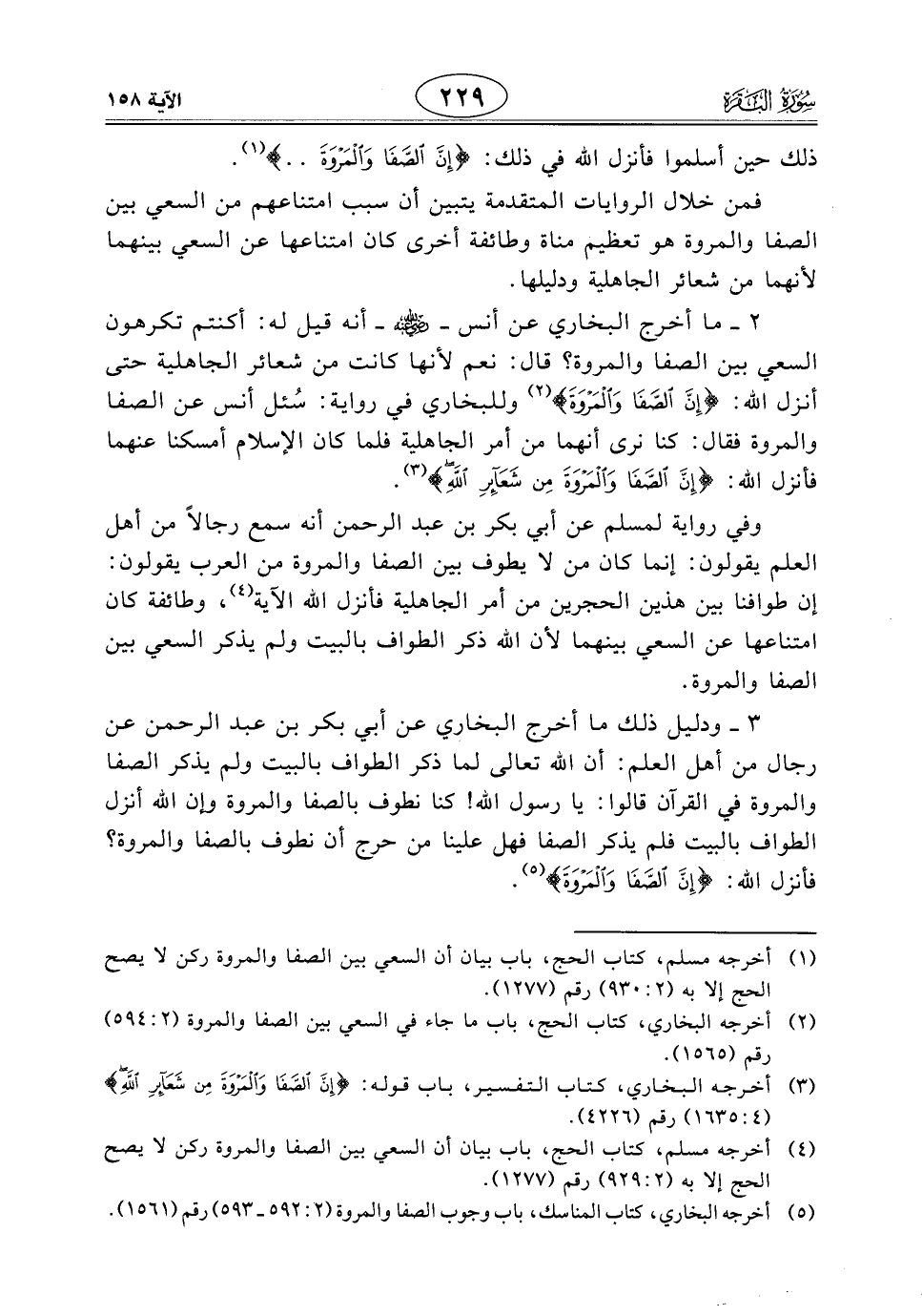 2 - ما أخرج البخاري عن أنس - رَضِيَ اللَّهُ عَنْهُ - أنه قيل له: أكنتم تكرهون السعي بين الصفا والمروة؟ قال: نعم لأنها كانت من شعائر الجاهلية حتى أنزل اللَّه: ((إِنَّ الصَّفَا وَالْمَرْوَةَ) وللبخاري في رواية: سُئل أنس عن الصفا والمروة فقال: كنا نرى أنهما من أمر الجاهلية فلما كان الإسلام أمسكنا عنهما فأنزل الله: (إِنَّ الصَّفَا وَالْمَرْوَةَ مِنْ شَعَائِرِ اللَّهِ).