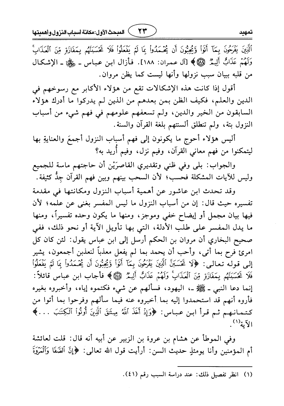 وقد تحدث ابن عاشور عن أهمية أسباب النزول ومكانتها في مقدمة تفسيره حيث قال: إن من أسباب النزول ما ليس المفسر بغنى عن علمه؛ لأن فيها بيان مجمل أو إيضاح خفي وموجز، ومنها ما يكون وحده تفسيرًا، ومنها ما يدل المفسر على طلب الأدلة، التي بها تأويل الآية أو نحو ذلك، ففي صحيح البخاري أن مروان بن الحكم أرسل إلى ابن عبَّاسٍ يقول: لئن كان كل امرئ فرح بما أتى، وأحب أن يحمد بما لم يفعل معذباً لنعذبن أجمعون، يشير إلى قوله تعالى: (لَا تَحْسَبَنَّ الَّذِينَ يَفْرَحُونَ بِمَا أَتَوْا وَيُحِبُّونَ أَنْ يُحْمَدُوا بِمَا لَمْ يَفْعَلُوا فَلَا تَحْسَبَنَّهُمْ بِمَفَازَةٍ مِنَ الْعَذَابِ وَلَهُمْ عَذَابٌ أَلِيمٌ (188)، فأجاب ابن عبَّاسٍ قائلاً: إنما دعا النبي - صَلَّى اللَّهُ عَلَيْهِ وَسَلَّمَ -، اليهود، فسألهم عن شيء فكتموه إياه، وأخبروه بغيره فأروه أنهم قد استحمدوا إليه بما أخبروه عنه فيما سألهم وفرحوا بما أتوا من كتمانهم ثم قرأ ابن عبَّاسٍ: (وَإِذْ أَخَذَ اللَّهُ مِيثَاقَ الَّذِينَ أُوتُوا الْكِتَابَ ... ) الآية.