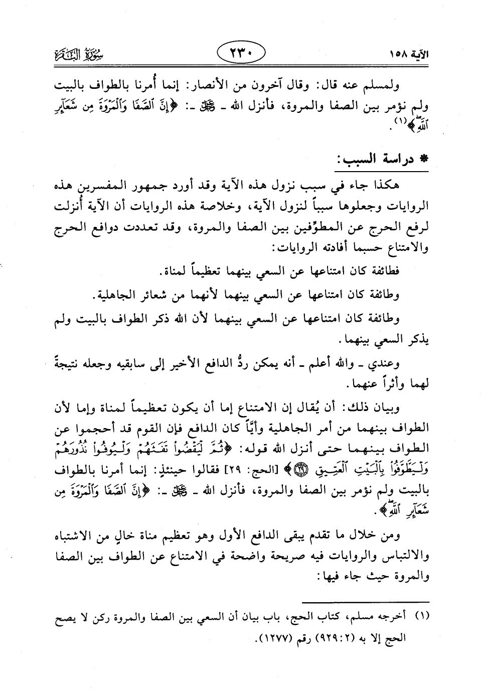 هكذا جاء في سبب نزول هذه الآية وقد أورد جمهور المفسريين هذه الروايات وجعلوها سبباً لنزول الآية، وخلاصة هذه الروايات أن الآية أُنزلت لرفع الحرج عن المطوِّفين بين الصفا والمروة، وقد تعددت دوافع الحرج والامتناع حسبما أفادته الروايات: