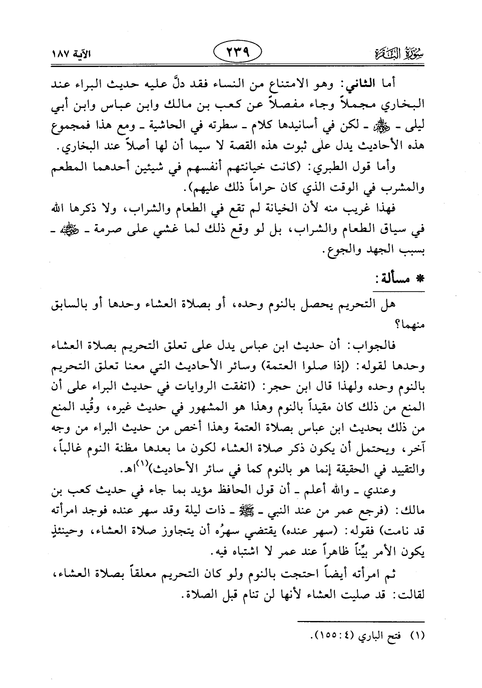 وعندي - واللَّه أعلم - أن قول الحافظ مؤيد بما جاء في حديث كعب بن مالك: (فرجع عمر من عند النبي - صَلَّى اللَّهُ عَلَيْهِ وَسَلَّمَ - ذات ليلة وقد سهر عنده فوجد امرأته قد نامت) فقوله: (سهر عنده) يقتضي سهرُه أن يتجاوز صلاة العشاء، وحينئذٍ يكون الأمر بيِّنا ظاهرًا عند عمر لا اشتباه فيه.
