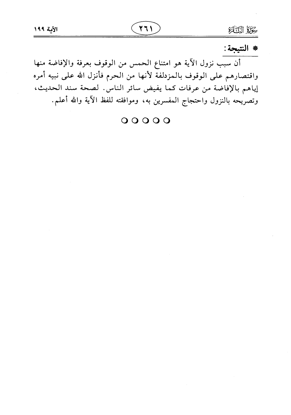 أن سبب نزول الآية هو امتناع الحمس من الوقوف بعرفة والإفاضة منها واقتصارهم على الوقوف بالمزدلفة لأنها من الحرم فأنزل اللَّه على نبيه أمره إياهم بالإفاضة من عرفات كما يفيض سائر الناس. لصحة سند الحديث، وتصريحه بالنزول واحتجاج المفسرين به، وموافقته للفظ الآية واللَّه أعلم.
