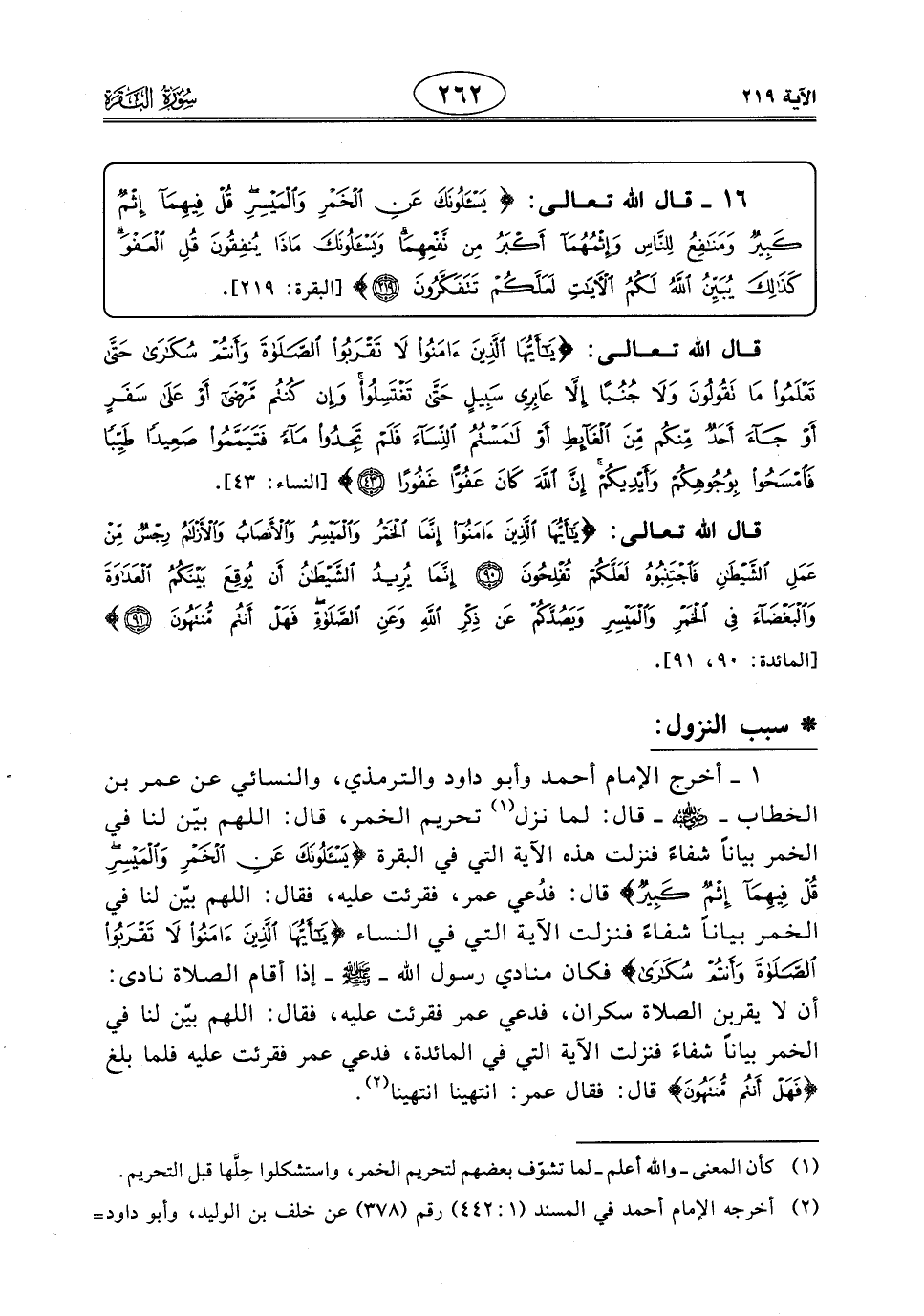 قال الله تعالى: (يَا أَيُّهَا الَّذِينَ آمَنُوا إِنَّمَا الْخَمْرُ وَالْمَيْسِرُ وَالْأَنْصَابُ وَالْأَزْلَامُ رِجْسٌ مِنْ عَمَلِ الشَّيْطَانِ فَاجْتَنِبُوهُ لَعَلَّكُمْ تُفْلِحُونَ (90) إِنَّمَا يُرِيدُ الشَّيْطَانُ أَنْ يُوقِعَ بَيْنَكُمُ الْعَدَاوَةَ وَالْبَغْضَاءَ فِي الْخَمْرِ وَالْمَيْسِرِ وَيَصُدَّكُمْ عَنْ ذِكْرِ اللَّهِ وَعَنِ الصَّلَاةِ فَهَلْ أَنْتُمْ مُنْتَهُونَ (91).