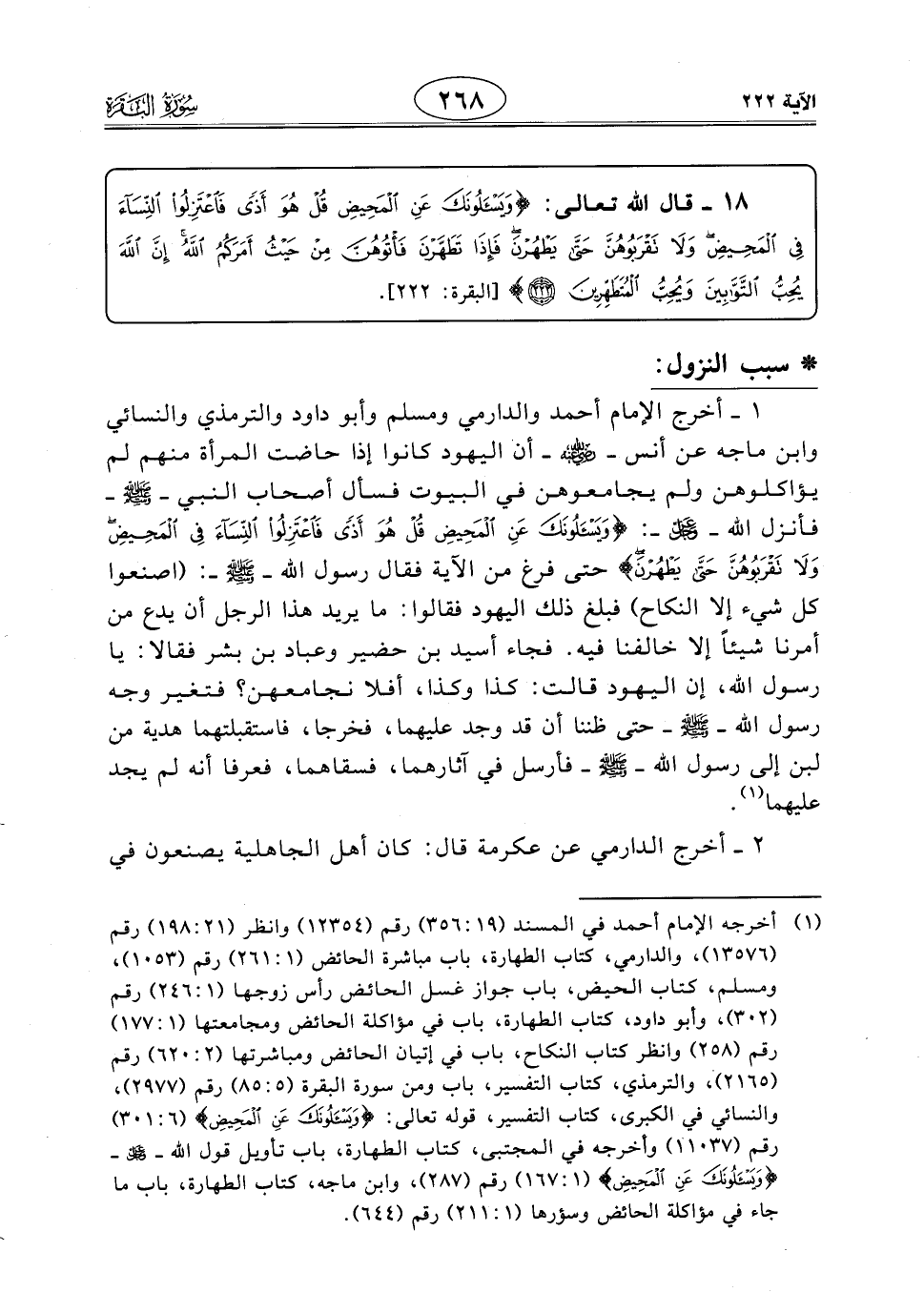 1 - أخرج الإمام أحمد والدارمي ومسلم وأبو داود والترمذي والنَّسَائِي وابن ماجه عن أنس - رَضِيَ اللَّهُ عَنْهُ - أن اليهود كانوا إذا حاضت المرأة منهم لم يؤاكلوهن ولم يجامعوهن في البيوت فسأل أصحاب النبي - صَلَّى اللَّهُ عَلَيْهِ وَسَلَّمَ - فأنزل الله - عَزَّ وَجَلَّ -: (وَيَسْأَلُونَكَ عَنِ الْمَحِيضِ قُلْ هُوَ أَذًى فَاعْتَزِلُوا النِّسَاءَ فِي الْمَحِيضِ وَلَا تَقْرَبُوهُنَّ حَتَّى يَطْهُرْنَ فَإِذَا تَطَهَّرْنَ) حتى فرغ من الآية فقال رسول اللَّه - صَلَّى اللَّهُ عَلَيْهِ وَسَلَّمَ -: (اصنعوا كل شيء إلا النكاح) فبلغ ذلك اليهود فقالوا: ما يريد هذا الرجل أن يدع من أمرنا شيئاً إلا خالفنا فيه. فجاء أسيد بن حضير وعباد بن بشر فقالا: يا رسول اللَّه، إن اليهود قالت: كذا وكذا، أفلا نجامعهن؟ فتغير وجه رسول اللَّه - صَلَّى اللَّهُ عَلَيْهِ وَسَلَّمَ - حتى ظننا أن قد وجد عليهما، فخرجا، فاستقبلتهما هدية من لبن إلى رسول اللَّه - صَلَّى اللَّهُ عَلَيْهِ وَسَلَّمَ - فأرسل في آثارهما، فسقاهما، فعرفا أنه لم يجد عليهما.