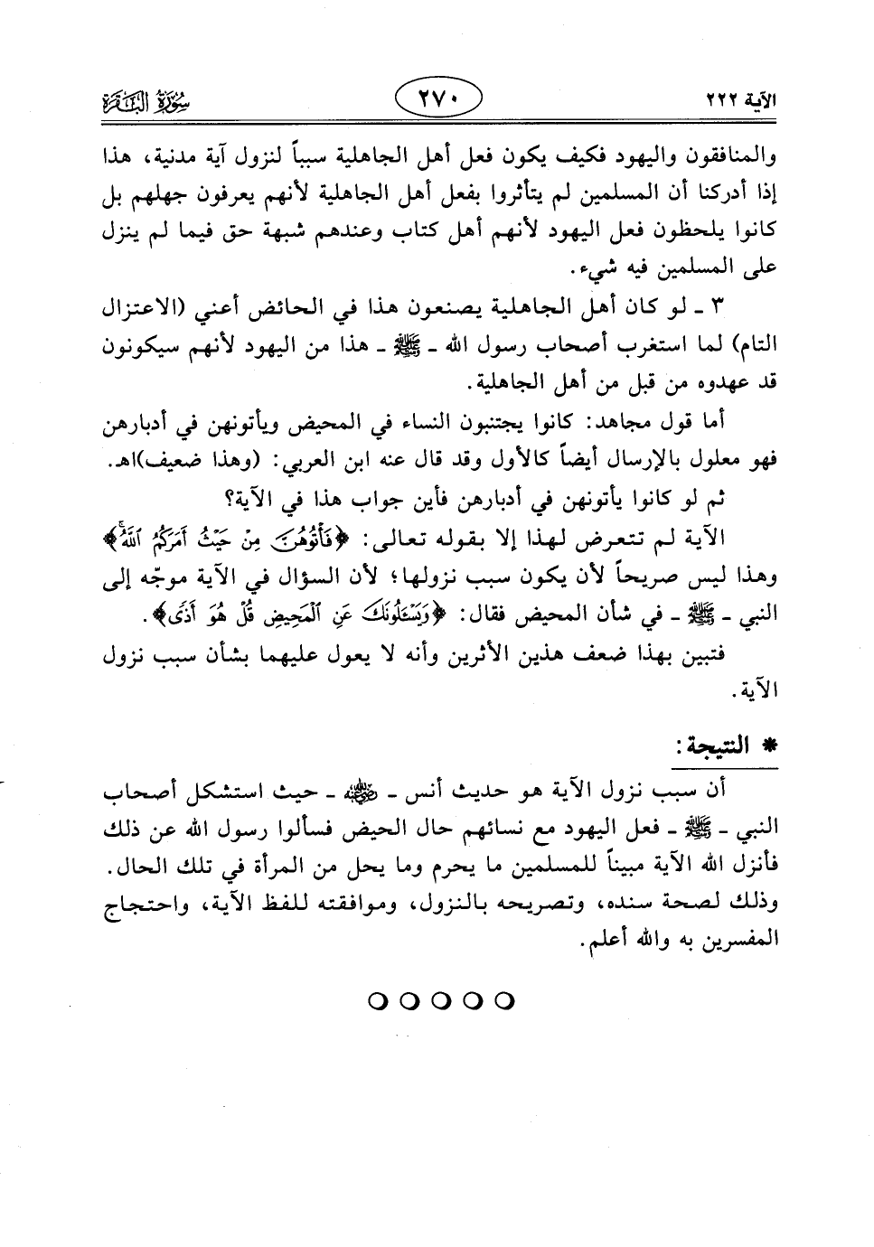 أن سبب نزول الآية هو حديث أنس - رَضِيَ اللَّهُ عَنْهُ - حيث استشكل أصحاب النبي - صَلَّى اللَّهُ عَلَيْهِ وَسَلَّمَ - فعل اليهود مع نسائهم حال الحيض فسألوا رسول الله عن ذلك فأنزل الله الآية مبينًا للمسلمين ما يحرم وما يحل من المرأة في تلك الحال. وذلك لصحة سنده، وتصريحه بالنزول، وموافقته للفظ الآية، واحتجاج المفسرين به والله أعلم.