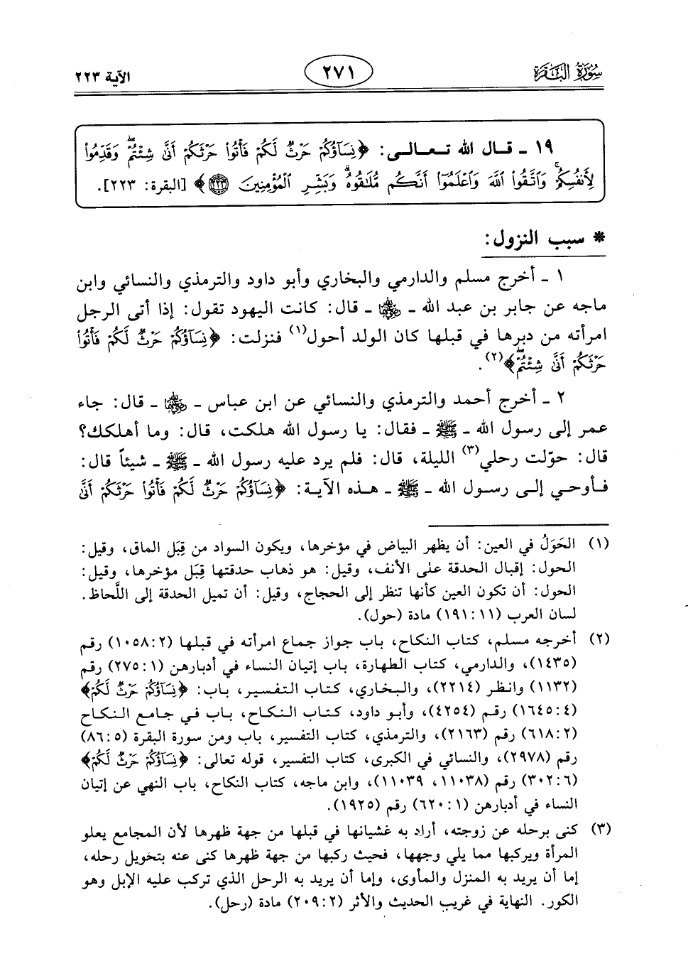 1 - أخرج مسلم والدارمي والبخاري وأبو داود والترمذي والنَّسَائِي وابن ماجه عن جابر بن عبد اللَّه - صَلَّى اللَّهُ عَلَيْهِ وَسَلَّمَ - قال: كانت اليهود تقول: إذا أتى الرجل امرأته من دبرها في قبلها كان الولد أحول فنزلت: (نِسَاؤُكُمْ حَرْثٌ لَكُمْ فَأْتُوا حَرْثَكُمْ أَنَّى شِئْتُمْ).