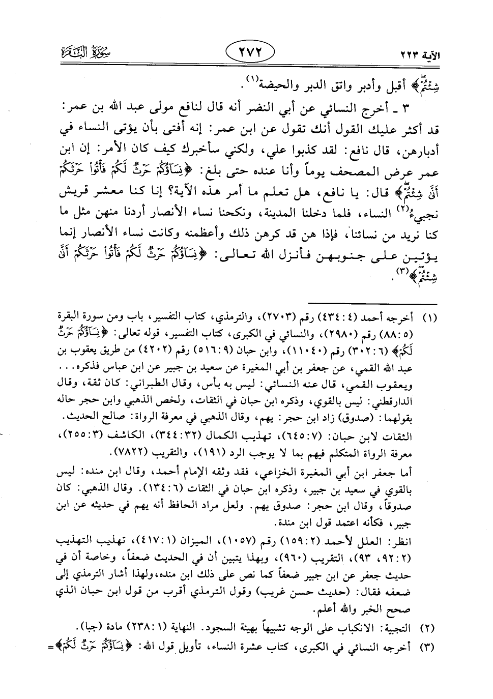3 - أخرج النَّسَائِي عن أبي النضر أنه قال لنافع مولى عبد اللَّه بن عمر: قد أكثر عليك القول أنك تقول عن ابن عمر: إنه أفتى بأن يؤتى النساء في أدبارهن، قال نافع: لقد كذبوا عليَّ، ولكني سأخبرك كيف كان الأمر: إن ابن عمر عرض المصحف يومًا وأنا عنده حتى بلغ: (نِسَاؤُكُمْ حَرْثٌ لَكُمْ فَأْتُوا حَرْثَكُمْ أَنَّى شِئْتُمْ) قال: يا نافع، هل تعلم ما أمر هذه الآية؟ إنا كنا معشر قريش نجبيءُ النساء، فلما دخلنا المدينة، ونكحنا نساء الأنصار أردنا منهن مثل ما كنا نريد من نسائنا، فإذا هن قد كرهن ذلك وأعظمنه وكانت نساء الأنصار إنما يؤتين على جنوبهن فأنزل اللَّه تعالى: ((نِسَاؤُكُمْ حَرْثٌ لَكُمْ فَأْتُوا حَرْثَكُمْ أَنَّى شِئْتُمْ).