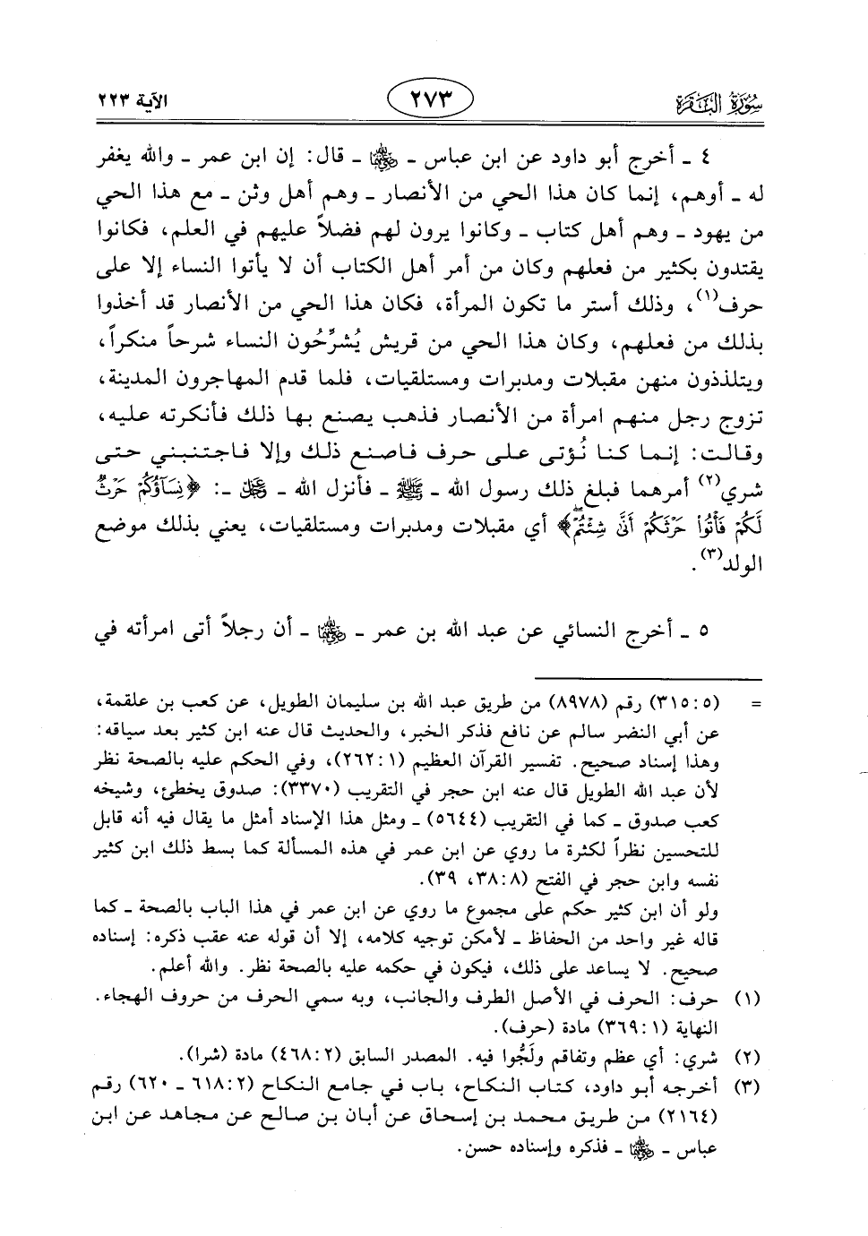4 - أخرج أبو داود عن ابن عبَّاسٍ - رَضِيَ اللَّهُ عَنْهُمَا - قال: إن ابن عمر - واللَّه يغفر له - أوهم، إنما كان هذا الحي من الأنصار - وهم أهل وثن - مع هذا الحي من يهود - وهم أهل كتاب - وكانوا يرون لهم فضلاً عليهم في العلم، فكانوا يقتدون بكثير من فعلهم وكان من أمر أهل الكتاب أن لا يأتوا النساء إلا على حرف، وذلك أستر ما تكون المرأة، فكان هذا الحي من الأنصار قد أخذوا بذلك من فعلهم، وكان هذا الحي من قريش يُشرِّحُون النساء شرحًا منكرًا، ويتلذذون منهن مقبلات ومدبرات ومستلقيات، فلما قدم المهاجرون المدينة، تزوج رجل منهم امرأة من الأنصار فذهب يصنع بها ذلك فأنكرته عليه، وقالت: إنما كنا نُؤتى على حرف فاصنع ذلك وإلا فاجتنبني حتى شري أمرهما فبلغ ذلك رسول اللَّه - صَلَّى اللَّهُ عَلَيْهِ وَسَلَّمَ - فأنزل اللَّه - عَزَّ وَجَلَّ -: ((نِسَاؤُكُمْ حَرْثٌ لَكُمْ فَأْتُوا حَرْثَكُمْ أَنَّى شِئْتُمْ) أي مقبلات ومدبرات ومستلقيات، يعني بذلك موضع الولد.