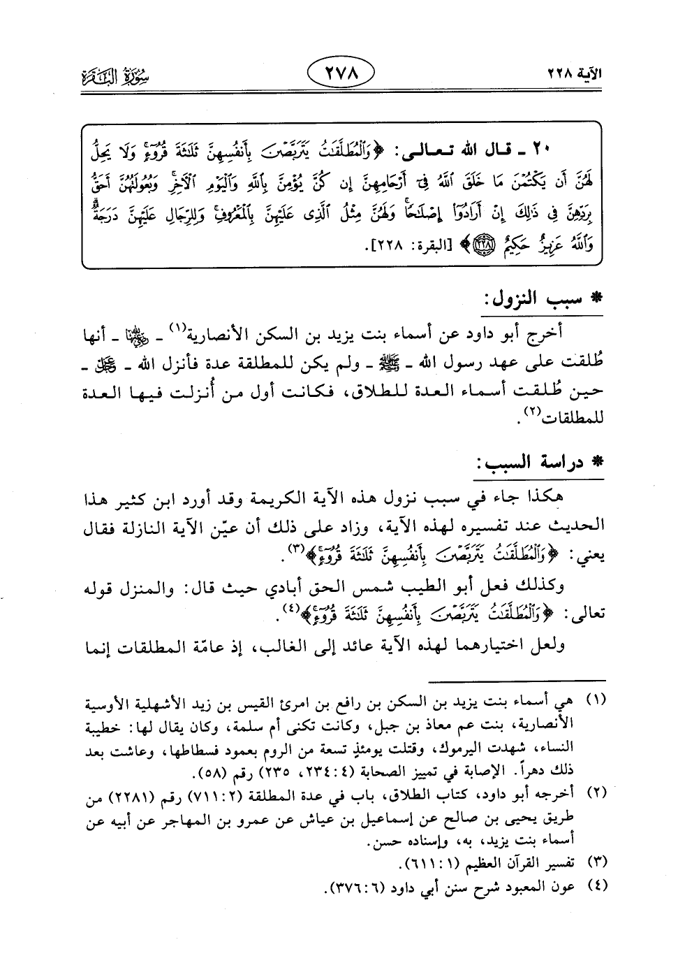 هكذا جاء في سبب نزول هذه الآية الكريمة وقد أورد ابن كثير هذا الحديث عند تفسيره لهذه الآية، وزاد على ذلك أن عيّن الآية النازلة فقال يعني: (وَالْمُطَلَّقَاتُ يَتَرَبَّصْنَ بِأَنْفُسِهِنَّ ثَلَاثَةَ قُرُوءٍ).