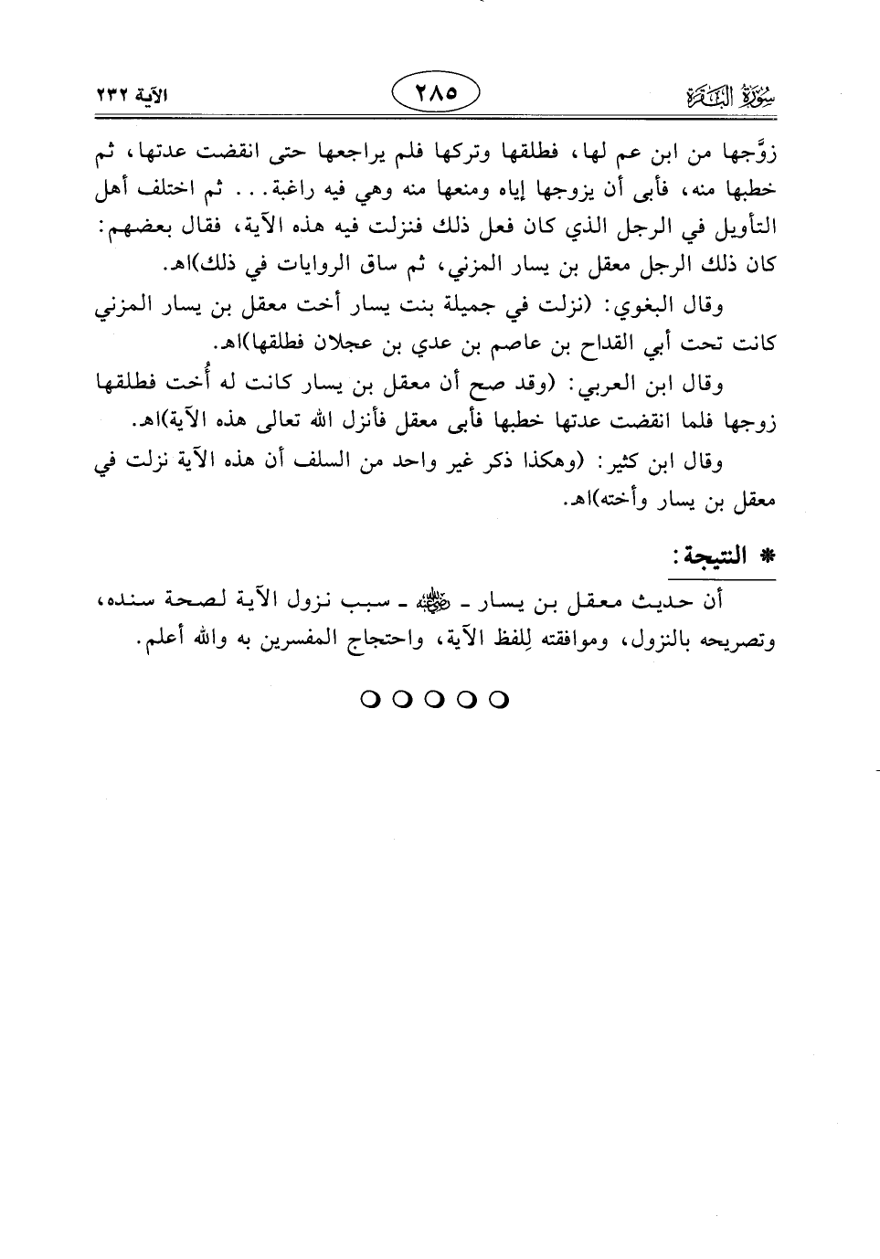وقال ابن كثير: (وهكذا ذكر غير واحد من السلف أن هذه الآية نزلت في معقل بن يسار وأخته) اهـ.