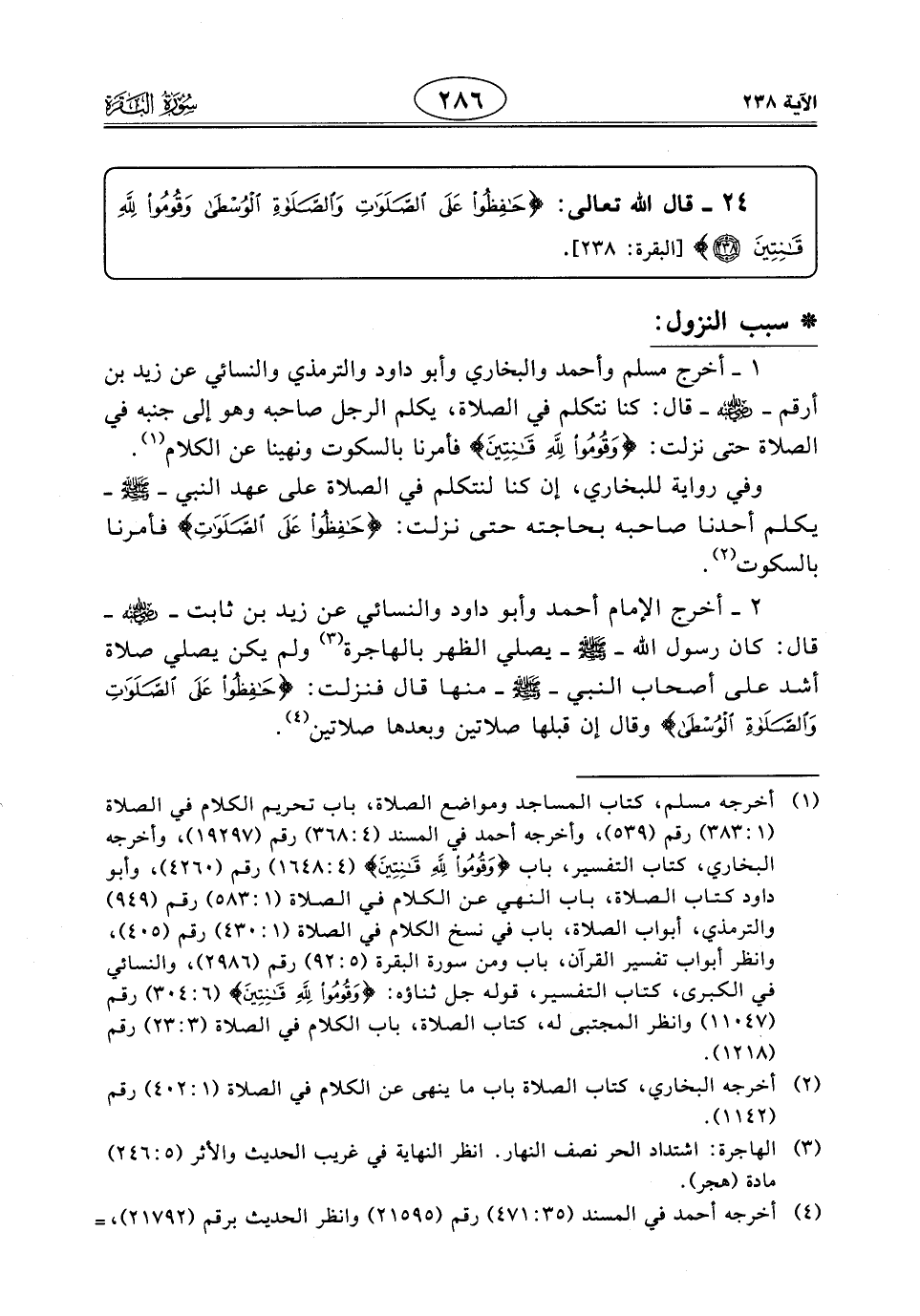1 - أخرج مسلم وأحمد والبخاري وأبو داود والترمذي والنَّسَائِي عن زيد بن أرقم - رَضِيَ اللَّهُ عَنْهُ - قال: كنا نتكلم في الصلاة، يكلم الرجل صاحبه وهو إلى جنبه في الصلاة حتى نزلت: (وَقُومُوا لِلَّهِ قَانِتِينَ) فأمرنا بالسكوت ونهينا عن الكلام.