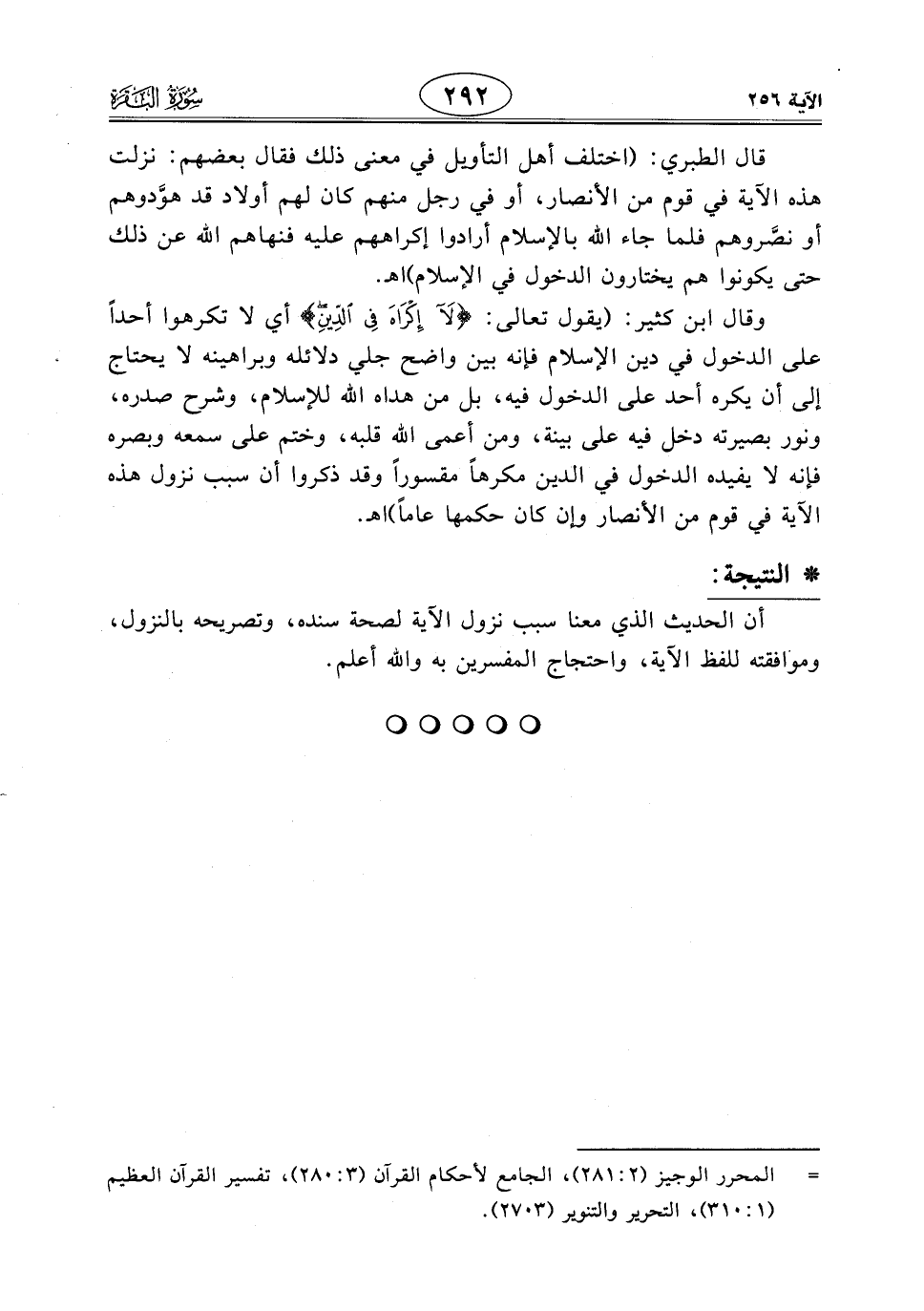 وقال ابن كثير: (يقول تعالى: (لَا إِكْرَاهَ فِي الدِّينِ) أي لا تكرهوا أحداً على الدخول في دين الإسلام فإنه بين واضح جلي دلائله وبراهينه لا يحتاج إلى أن يكره أحد على الدخول فيه، بل من هداه الله للإسلام، وشرح صدره، ونور بصيرته دخل فيه على بينة، ومن أعمى اللَّه قلبه، وختم على سمعه وبصره فإنه لا يفيده الدخول في الدين مكرهاً مقسوراً وقد ذكروا أن سبب نزول هذه الآية في قوم من الأنصار وإن كان حكمها عاماً). اهـ.
