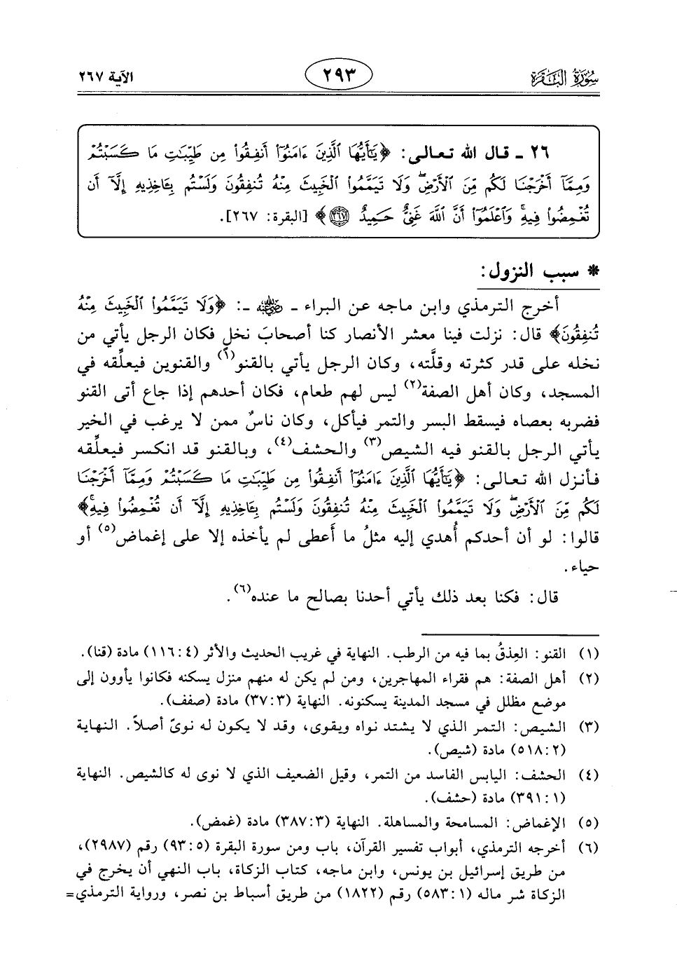 أخرج الترمذي وابن ماجه عن البراء - رَضِيَ اللَّهُ عَنْهُ -: (وَلَا تَيَمَّمُوا الْخَبِيثَ مِنْهُ تُنْفِقُونَ) قال: نزلت فينا معشر الأنصار كنا أصحابَ نخلٍ فكان الرجل يأتي من نخله على قدر كثرته وقلَّته، وكان الرجل يأتي بالقنو والقنوين فيعلِّقه في المسجد، وكان أهل الصفة ليس لهم طعام، فكان أحدهم إذا جاع أتى القنو فضربه بعصاه فيسقط البسر والتمر فيأكل، وكان ناسٌ ممن لا يرغب في الخير يأتي الرجل بالقنو فيه الشيص والحشف، وبالقنو قد انكسر فيعلِّقه فأنزل اللَّه تعالى: ((يَا أَيُّهَا الَّذِينَ آمَنُوا أَنْفِقُوا مِنْ طَيِّبَاتِ مَا كَسَبْتُمْ وَمِمَّا أَخْرَجْنَا لَكُمْ مِنَ الْأَرْضِ وَلَا تَيَمَّمُوا الْخَبِيثَ مِنْهُ تُنْفِقُونَ وَلَسْتُمْ بِآخِذِيهِ إِلَّا أَنْ تُغْمِضُوا فِيهِ) قالوا: لو أن أحدكم أُهدي إليه مثلُ ما أَعطى لم يأخذه إلا على إغماض أو حياء.