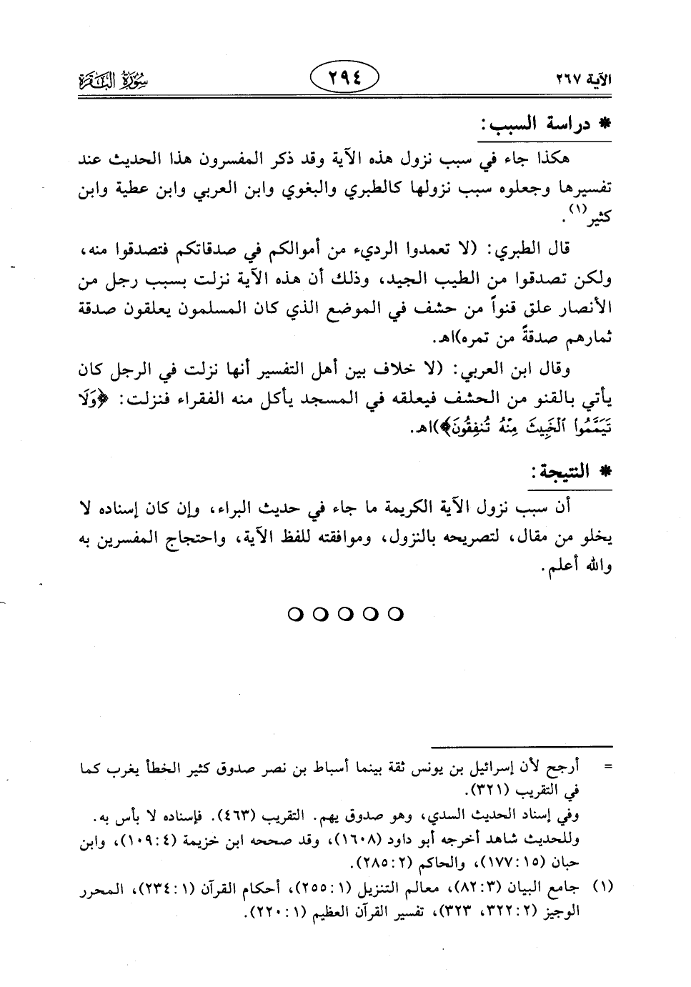 أن سبب نزول الآية الكريمة ما جاء فى حديث البراء، وإن كان إسناده لا يخلو من مقال، لتصريحه بالنزول، وموافقته للفظ الآية، واحتجاج المفسرين به والله أعلم.