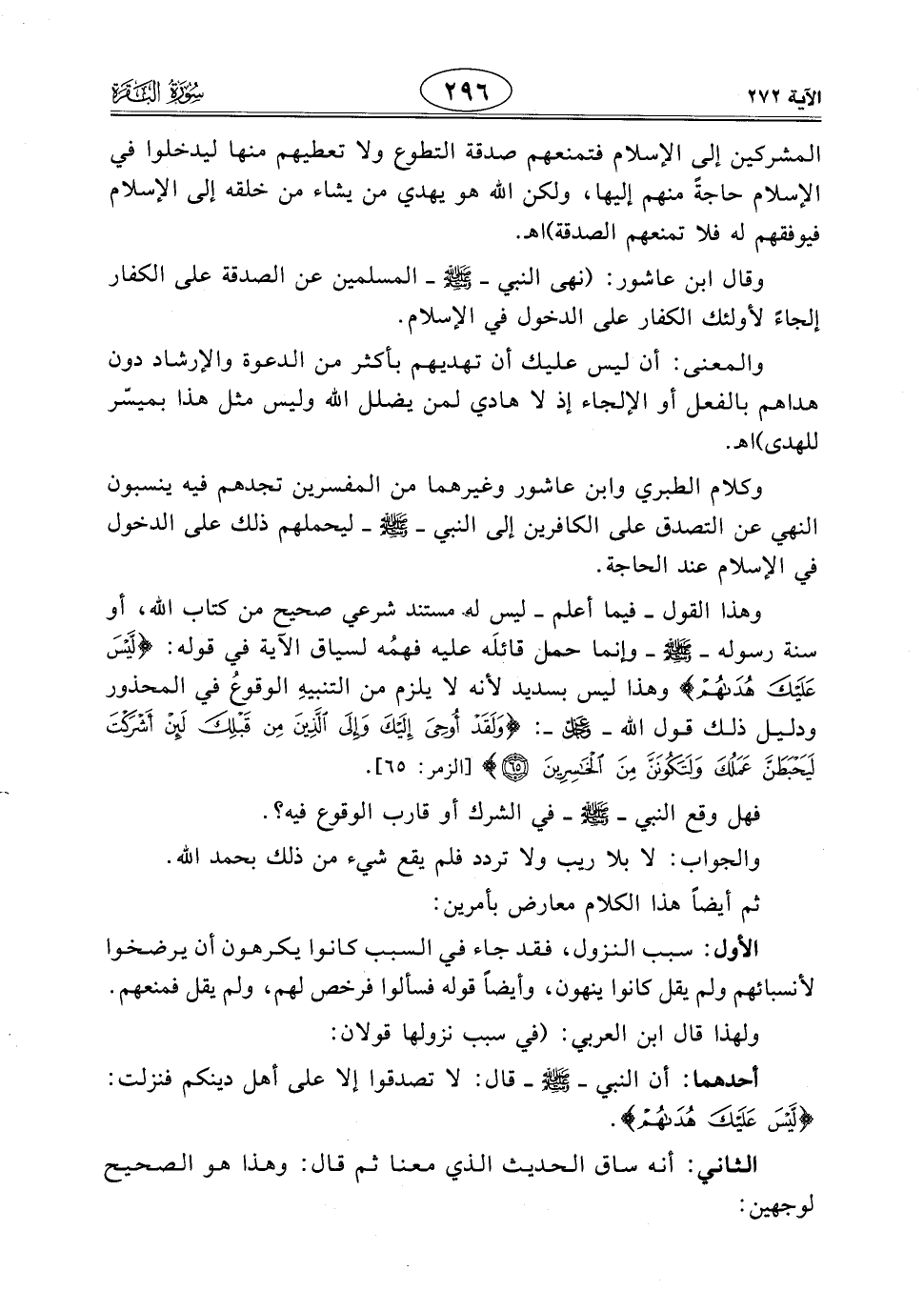 وكلام الطبري وابن عاشور وغيرهما من المفسرين تجدهم فيه ينسبون النهي عن التصدق على الكافرين إلى النبي - صَلَّى اللَّهُ عَلَيْهِ وَسَلَّمَ - ليحملهم ذلك على الدخول في الإسلام عند الحاجة.