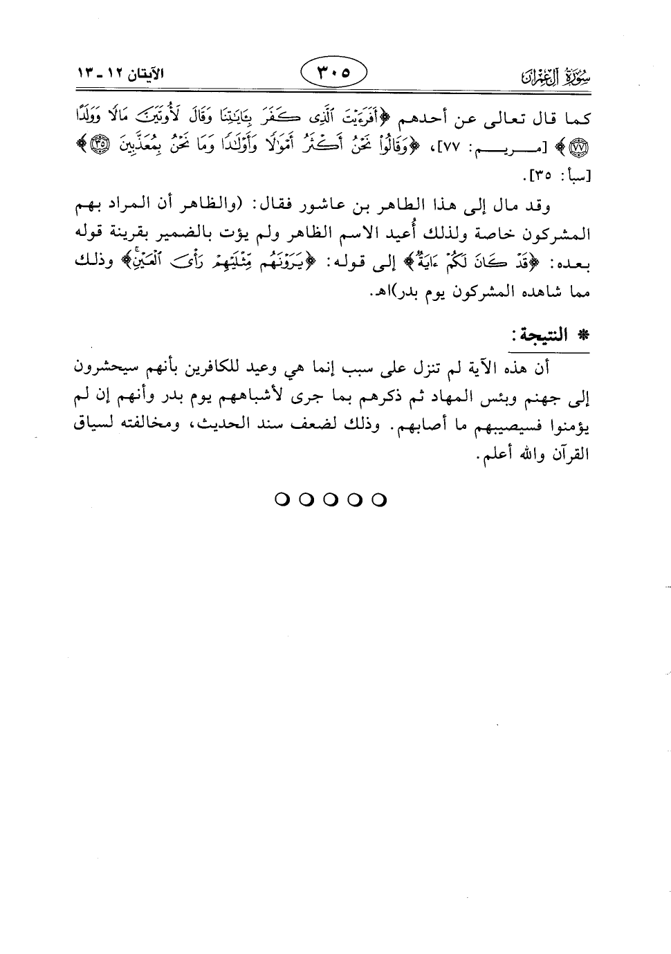 أن هذه الآية لم تنزل على سبب إنما هي وعيد للكافرين بأنهم سيحشرون إلى جهنم وبئس المهاد ثم ذكرهم بما جرى لأشباههم يوم بدر وأنهم إن لم يؤمنوا فسيصيبهم ما أصابهم. وذلك لضعف سند الحديث، ومخالفته لسياق القرآن واللَّه أعلم.