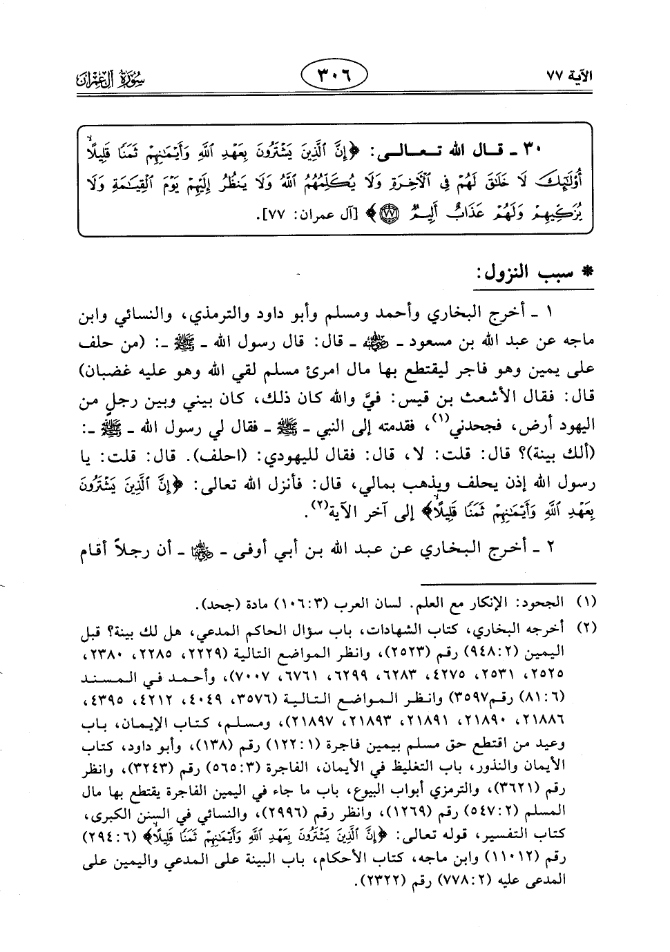 1 - أخرج البخاري وأحمد ومسلم وأبو داود والترمذي، والنَّسَائِي وابن ماجه عن عبد الله بن مسعود - رَضِيَ اللَّهُ عَنْهُ - قال: قال رسول الله - صَلَّى اللَّهُ عَلَيْهِ وَسَلَّمَ -: (من حلف على يمين وهو فاجر ليقتطع بها مال امرئ مسلم لقي الله وهو عليه غضبان) قال: فقال الأشعث بن قيس: فيَّ والله كان ذلك، كان بيني وبين رجلٍ من اليهود أرض، فجحدني، فقدمته إلى النبي - صَلَّى اللَّهُ عَلَيْهِ وَسَلَّمَ - فقال لي رسول الله - صَلَّى اللَّهُ عَلَيْهِ وَسَلَّمَ -: (ألك بينة)؟ قال: قلت: لا، قال: فقال لليهودي: (احلف). قال: قلت: يا رسول الله إذن يحلف ويذهب بمالي، قال: فأنزل الله تعالى: (إِنَّ الَّذِينَ يَشْتَرُونَ بِعَهْدِ اللَّهِ وَأَيْمَانِهِمْ ثَمَنًا قَلِيلًا) إلى آخر الآية.