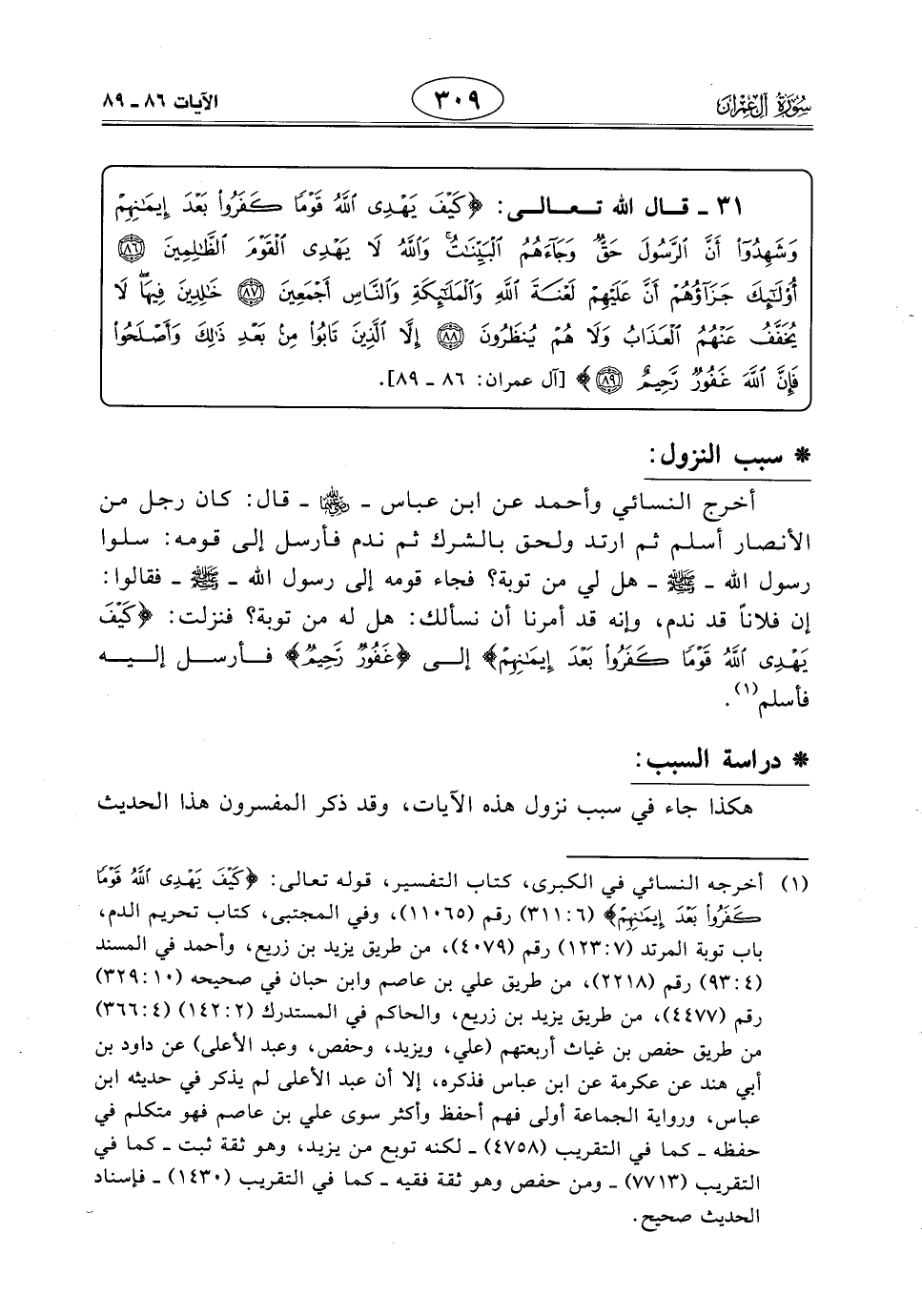 31 - قال الله تعالى: (كَيْفَ يَهْدِي اللَّهُ قَوْمًا كَفَرُوا بَعْدَ إِيمَانِهِمْ وَشَهِدُوا أَنَّ الرَّسُولَ حَقٌّ وَجَاءَهُمُ الْبَيِّنَاتُ وَاللَّهُ لَا يَهْدِي الْقَوْمَ الظَّالِمِينَ (86) أُولَئِكَ جَزَاؤُهُمْ أَنَّ عَلَيْهِمْ لَعْنَةَ اللَّهِ وَالْمَلَائِكَةِ وَالنَّاسِ أَجْمَعِينَ (87) خَالِدِينَ فِيهَا لَا يُخَفَّفُ عَنْهُمُ الْعَذَابُ وَلَا هُمْ يُنْظَرُونَ (88) إِلَّا الَّذِينَ تَابُوا مِنْ بَعْدِ ذَلِكَ وَأَصْلَحُوا فَإِنَّ اللَّهَ غَفُورٌ رَحِيمٌ (89)