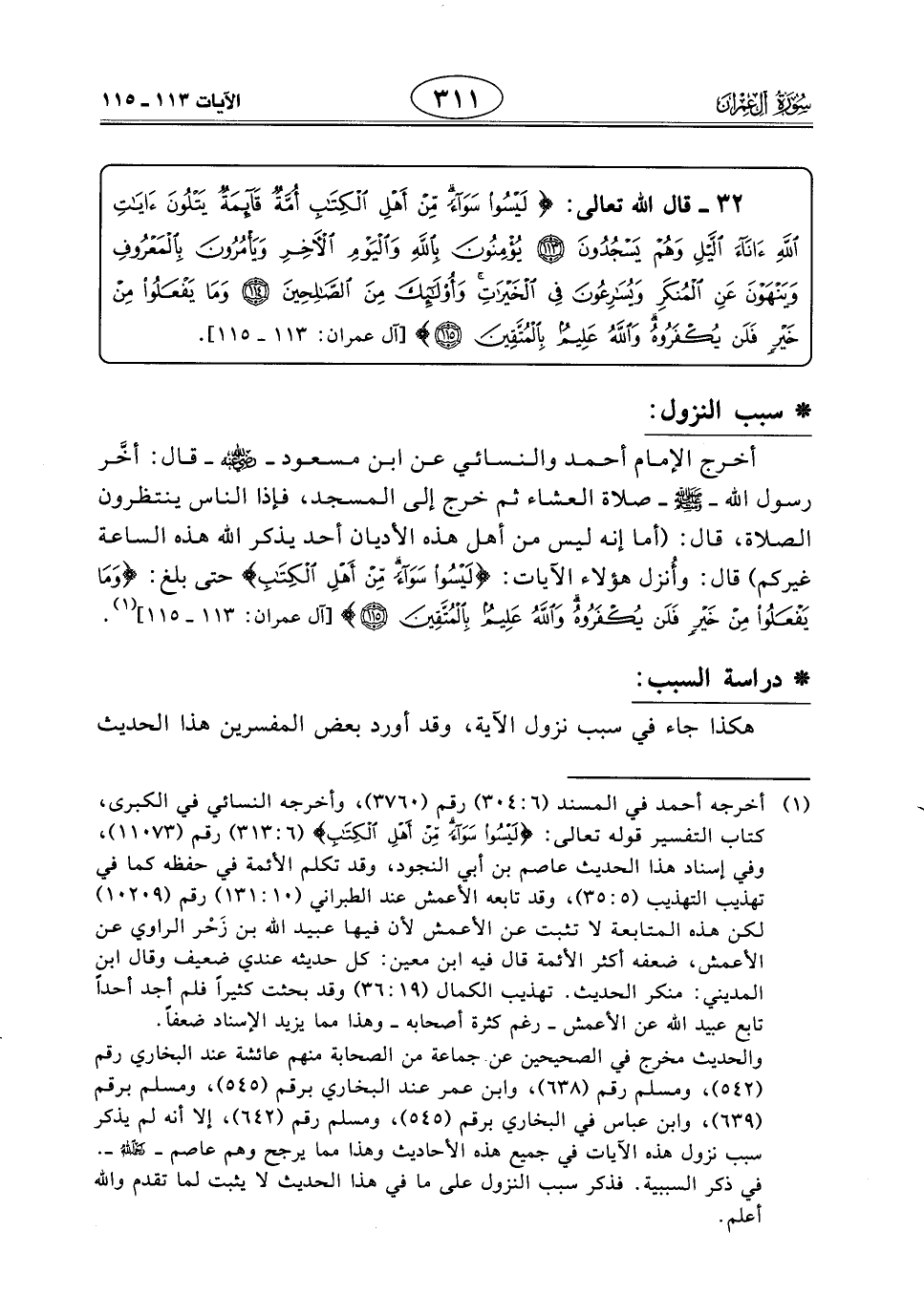 أخرج الإمام أحمد والنَّسَائِي عن ابن مسعود - رَضِيَ اللَّهُ عَنْهُ - قال: أخَّر رسول اللَّه - صَلَّى اللَّهُ عَلَيْهِ وَسَلَّمَ - صلاة العشاء ثم خرج إلى المسجد، فإذا الناس ينتظرون الصلاة، قال: (أما إنه ليس من أهل هذه الأديان أحد يذكر اللَّه هذه الساعة غيركم) قال: وأُنزل هؤلاء الآيات: (لَيْسُوا سَوَاءً مِنْ أَهْلِ الْكِتَابِ) حتى بلغ: (وَمَا يَفْعَلُوا مِنْ خَيْرٍ فَلَنْ يُكْفَرُوهُ وَاللَّهُ عَلِيمٌ بِالْمُتَّقِينَ).