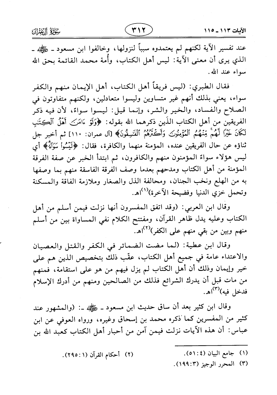 فقال الطبري: (ليس فريقاً أهل الكتاب، أهل الإيمان منهم والكفر سواء، يعني بذلك أنهم غير متساوين وليسوا متعادلين، ولكنهم متفاوتون في الصلاح والفساد، والخير والشر، وإنما قيل: ليسوا سواءً، لأن فيه ذكر الفريقين من أهل الكتاب الذَين ذكرهما اللَّه بقوله: (وَلَوْ آمَنَ أَهْلُ الْكِتَابِ لَكَانَ خَيْرًا لَهُمْ مِنْهُمُ الْمُؤْمِنُونَ وَأَكْثَرُهُمُ الْفَاسِقُونَ)، ثم أخبر جل ثناؤه عن حال الفريقين عنده، المؤمنة منهما والكافرة، فقال: ((لَيْسُوا سَوَاءً) أي ليس هؤلاء سواء المؤمنون منهم والكافرون، ثم ابتدأ الخبر عن صفة الفرقة المؤمنة من أهل الكتاب ومدحهم بعدما وصف الفرقة الفاسقة منهم بما وصفها به من الهلع ونخب الجنان، ومحالفة الذل والصغار وملازمة الفاقة والمسكنة وتحمل خزي الدنيا وفضيحة الآخرة) اهـ.