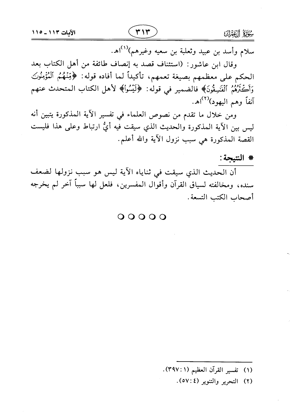 وقال ابن عاشور: (استئناف قصد به إنصاف طائفة من أهل الكتاب بعد الحكم على معظمهم بصيغة تعمهم، تأكيداً لما أفاده قوله: (مِنْهُمُ الْمُؤْمِنُونَ وَأَكْثَرُهُمُ الْفَاسِقُونَ) فالضمير في قوله: (لَيْسُوا) لأهل الكتاب المتحدث عنهم آنفاً وهم اليهود) اهـ.