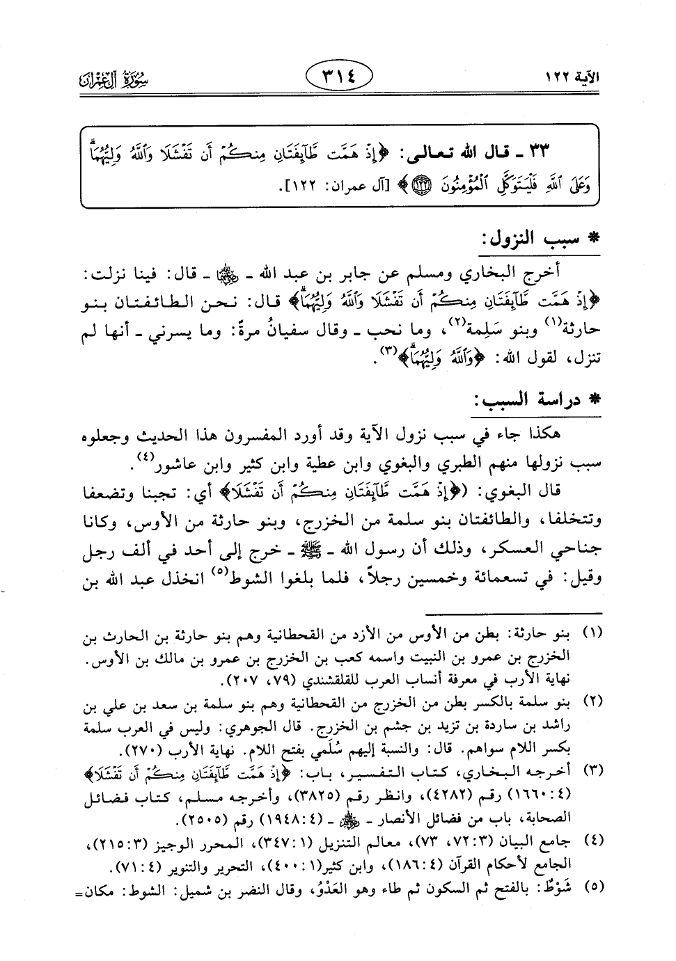 قال البغوي: (إِذْ هَمَّتْ طَائِفَتَانِ مِنْكُمْ أَنْ تَفْشَلَا) أي: تجبنا وتضعفا وتتخلفا، والطائفتان بنو سلمة من الخزرج، وبنو حارثة من الأوس، وكانا جناحي العسكر، وذلك أن رسول الله - صَلَّى اللَّهُ عَلَيْهِ وَسَلَّمَ - خرج إلى أحد في ألف رجل وقيل: في تسعمائة وخمسين رجلاً، فلما بلغوا الشوط انخذل عبد اللَّه بن