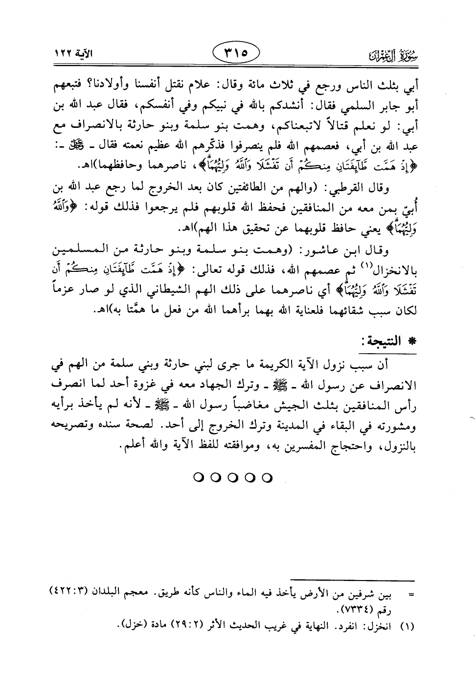 أبي بثلث الناس ورجع في ثلاث مائة وقال: علام نقتل أنفسنا وأولادنا؟ فتبعهم أبو جابر السلمي فقال: أنشدكم باللَّه في نبيكم وفي أنفسكم، فقال عبد الله بن أبي: لو نعلم قتالاً لاتبعناكم، وهمت بنو سلمة وبنو حارثة بالانصراف مع عبد اللَّه بن أبي، فعصمهم الله فلم ينصرفوا فذكَّرهم اللَّه عظيم نعمته فقال - عَزَّ وَجَلَّ -: (إِذْ هَمَّتْ طَائِفَتَانِ مِنْكُمْ أَنْ تَفْشَلَا وَاللَّهُ وَلِيُّهُمَا)، ناصرهما وحافظهما) اهـ.