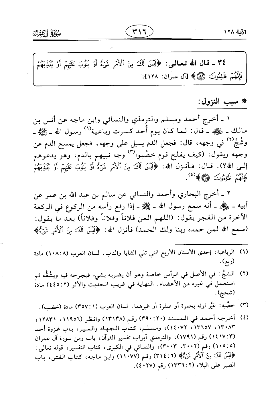1 - أخرج أحمد ومسلم والترمذي والنَّسَائِي وابن ماجه عن أنس بن مالك - رَضِيَ اللَّهُ عَنْهُ - قال: لما كان يوم أُحد كسرت رباعية رسول اللَّه - صَلَّى اللَّهُ عَلَيْهِ وَسَلَّمَ - وشُجَّ في وجهه، قال: فجعل الدم يسيل على وجهه، فجعل يمسح الدم عن وجهه ويقول: (كيف يفلح قوم خضَّبوا وجه نبيهم بالدم، وهو يدعوهم إلى اللَّه؟). قال: فأنزل اللَّه: (لَيْسَ لَكَ مِنَ الْأَمْرِ شَيْءٌ أَوْ يَتُوبَ عَلَيْهِمْ أَوْ يُعَذِّبَهُمْ فَإِنَّهُمْ ظَالِمُونَ).