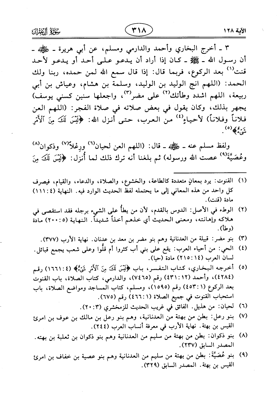 3 - أخرج البخاري وأحمد والدارمي ومسلم، عن أبي هريرة - رَضِيَ اللَّهُ عَنْهُ - أن رسول الله - صَلَّى اللَّهُ عَلَيْهِ وَسَلَّمَ - كان إذا أراد أن يدعو على أحد أو يدعو لأحد قنت بعد الركوع، فربما قال: إذا قال سمع الله لمن حمده، ربنا ولك الحمد: (اللهم انج الوليد بن الوليد، وسلمة بن هشام، وعياش بن أبي ربيعة، اللهم اشدد وطأتك على مضر، واجعلها سنين كسني يوسف) يجهر بذلك، وكان يقول في بعض صلاته في صلاة الفجر: (اللهم العن فلانًا وفلانًا) لأحياءٍ من العرب، حتى أنزل الله: (لَيْسَ لَكَ مِنَ الْأَمْرِ شَيْءٌ).