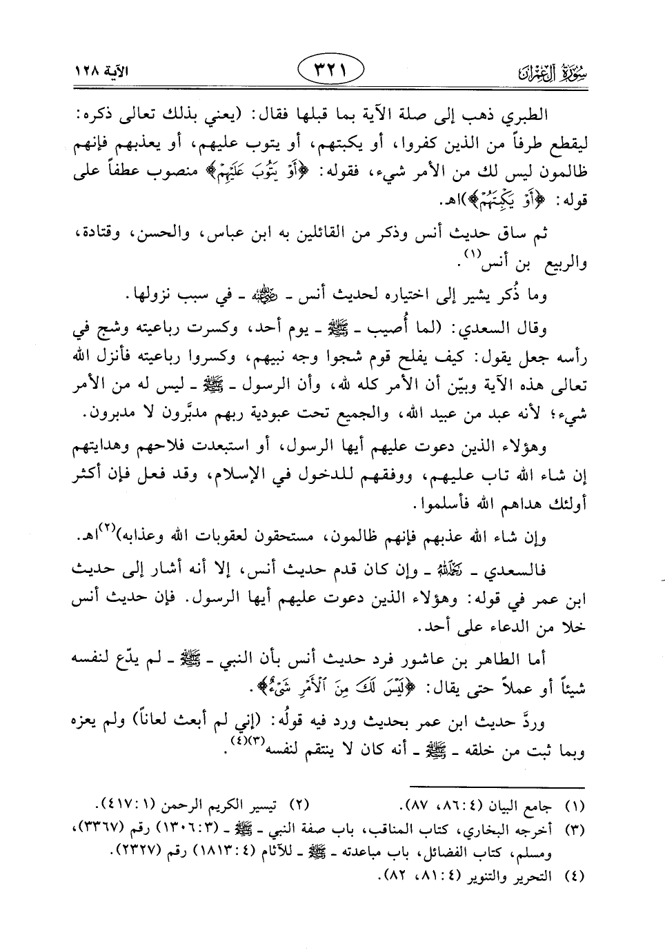 أما الطاهر بن عاشور فرد حديث أنس بأن النبي - صَلَّى اللَّهُ عَلَيْهِ وَسَلَّمَ - لم يدّع لنفسه شيئاً أو عملاً حتى يقال: (لَيْسَ لَكَ مِنَ الْأَمْرِ شَيْءٌ).