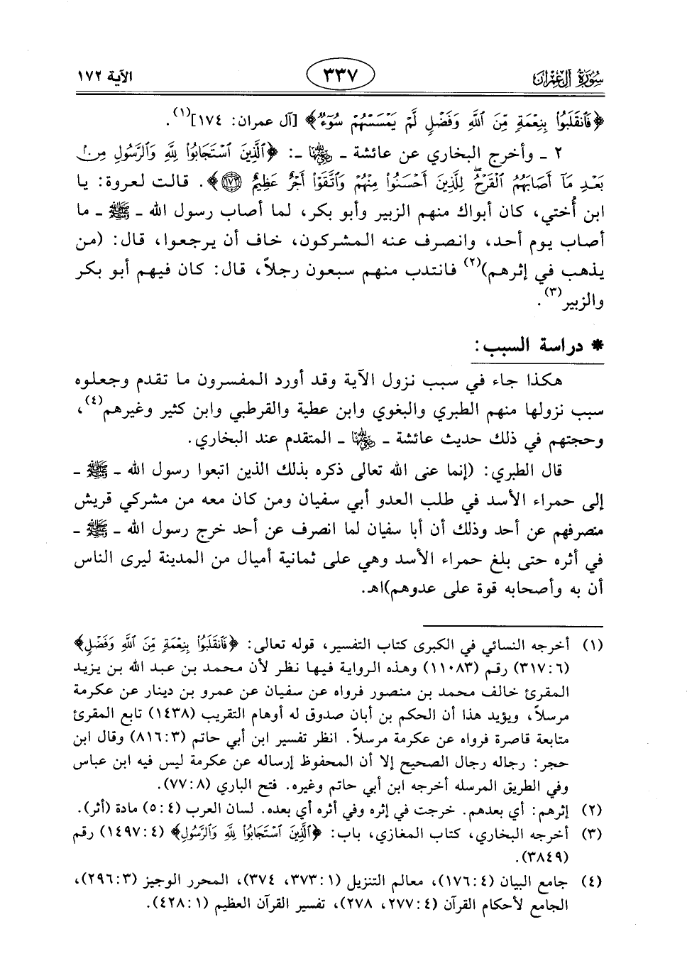 2 - وأخرج البخاري عن عائشة - رضي الله عنها -: (الَّذِينَ اسْتَجَابُوا لِلَّهِ وَالرَّسُولِ مِنْ بَعْدِ مَا أَصَابَهُمُ الْقَرْحُ لِلَّذِينَ أَحْسَنُوا مِنْهُمْ وَاتَّقَوْا أَجْرٌ عَظِيمٌ). قالت لعروة: يا ابن أُختي، كان أبواك منهم الزبير وأبو بكر، لما أصاب رسول اللَّه - صَلَّى اللَّهُ عَلَيْهِ وَسَلَّمَ - ما أصاب يوم أحد، وانصرف عنه المشركون، خاف أن يرجعوا، قال: (من يذهب في إثرهم) فانتدب منهم سبعون رجلاً، قال: كان فيهم أبو بكر والزبير.