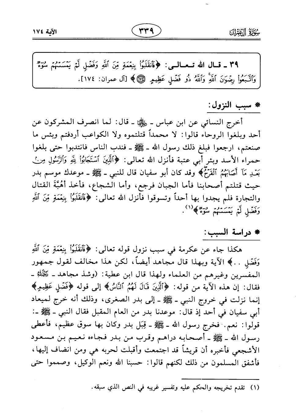 39 - قال الله تعالى: (فَانْقَلَبُوا بِنِعْمَةٍ مِنَ اللَّهِ وَفَضْلٍ لَمْ يَمْسَسْهُمْ سُوءٌ وَاتَّبَعُوا رِضْوَانَ اللَّهِ وَاللَّهُ ذُو فَضْلٍ عَظِيمٍ (174)