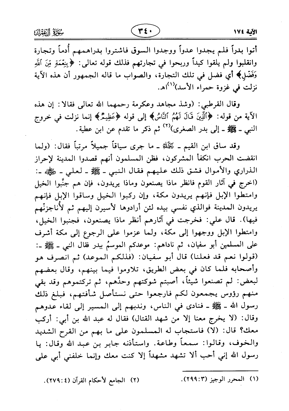 أتوا بدراً فلم يجدوا عدواً ووجدوا السوق فاشتروا بدراهمهم أُدما وتجارة وانقلبوا ولم يلقوا كيداً وربحوا في تجارتهم فذلك قوله تعالى: (بِنِعْمَةٍ مِنَ اللَّهِ وَفَضْلٍ) أي فضل في تلك التجارة، والصواب ما قاله الجمهور أن هذه الآية نزلت في غزوة حمراء الأسد) اهـ.