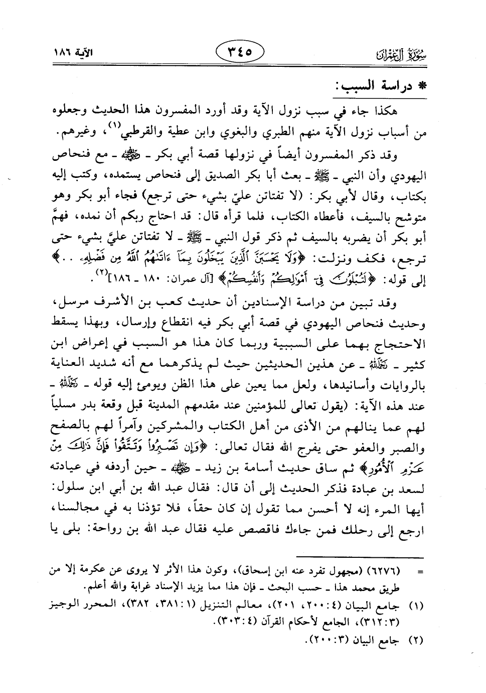 وقد تبين من دراسة الإسنادين أن حديث كعب بن الأشرف مرسل، وحديث فنحاص اليهودي في قصة أبي بكر فيه انقطاع وإرسال، وبهذا يسقط الاحتجاج بهما على السببية وربما كان هذا هو السبب في إعراض ابن كثير - رحمه الله - عن هذين الحديثين حيث لم يذكرهما مع أنه شديد العناية بالروايات وأسانيدها، ولعل مما يعين على هذا الظن ويومئ إليه قوله - رحمه الله - عند هذه الآية: (يقول تعالى للمؤمنين عند مقدمهم المدينة قبل وقعة بدر مسلياً لهم عما ينالهم من الأذى من أهل الكتاب والمشركين وآمراً لهم بالصفح والصبر والعفو حتى يفرج اللَّه فقال تعالى: (وَإِنْ تَصْبِرُوا وَتَتَّقُوا فَإِنَّ ذَلِكَ مِنْ عَزْمِ الْأُمُورِ) ثم ساق حديث أسامة بن زيد - رَضِيَ اللَّهُ عَنْهُمَا - حين أردفه في عيادته لسعد بن عبادة فذكر الحديث إلى أن قال: فقال عبد الله بن أبي ابن سلول: أيها المرء إنه لا أحسن مما تقول إن كان حقًا، فلا تؤذنا به في مجالسنا، ارجع إلى رحلك فمن جاءك فاقصص عليه فقال عبد اللَّه بن رواحة: بلى يا